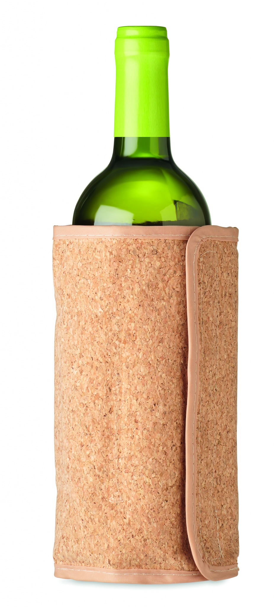 Soft wine cooler in cork wrap with PVC sheeting with gel inside. It has an adjustable hook and loop fastening. Cork is 100% natural material. Due to its structural nature and surface porosity the final print result per item may have deviations.