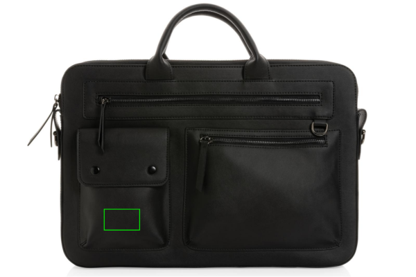 The Swiss Peak GRS recycled PU 14 inch laptop bag breathes modern luxury with a smooth finish in a rich black hue. Includes a detachable strap with dark coloured hardware and two front zipped compartments. Made with GRS certified recycled materials. Made from 100% GRS certified PU. GRS certification ensures a completely certified supply chain of the recycled materials. Total recycled content: 61% based on total item weight. PVC free.