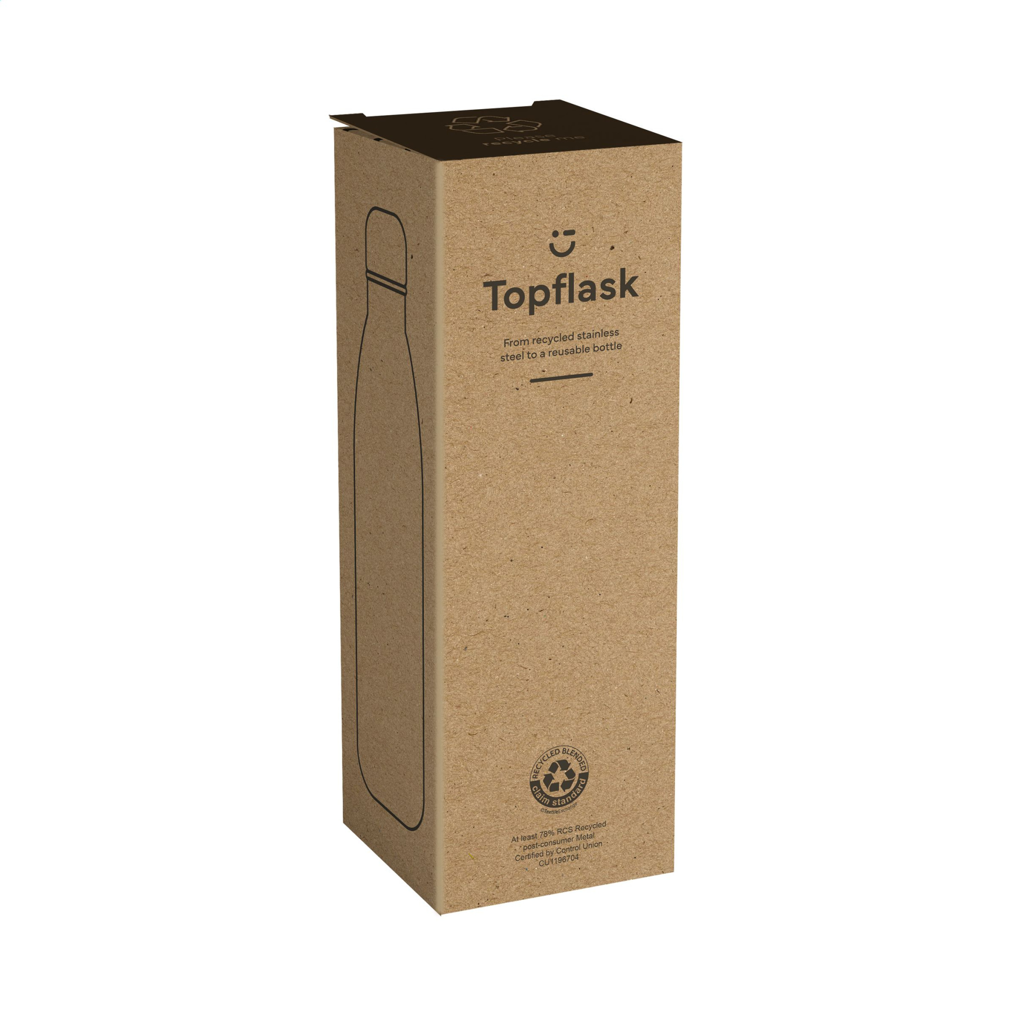 WoW! Single-walled water bottle made from recycled stainless steel. With leak proof screw cap. RCS-certified. Total recycled material: 78%. Capacity 500 ml. Stainless steel can be recycled many times whilst retaining the quality of the material. By using recycled stainless steel, fewer new raw materials are needed. This means less energy consumption and less use of water. A responsible choice. Each item is supplied in an individual brown cardboard box.