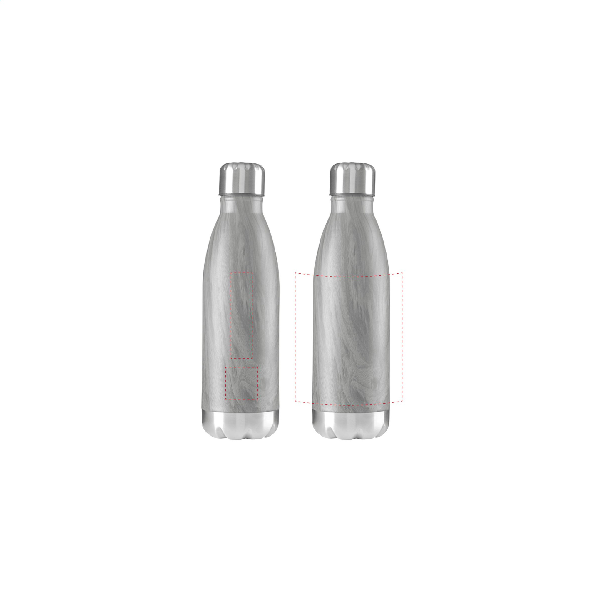 Double-walled, vacuum-insulated, stainless steel water bottle. With leakproof screw top. This elegant model has a striking, attractive top layer with a wood grain pattern. Suitable for maintaining the temperature of cold or hot water. Capacity 500 ml. Each item is individually boxed.