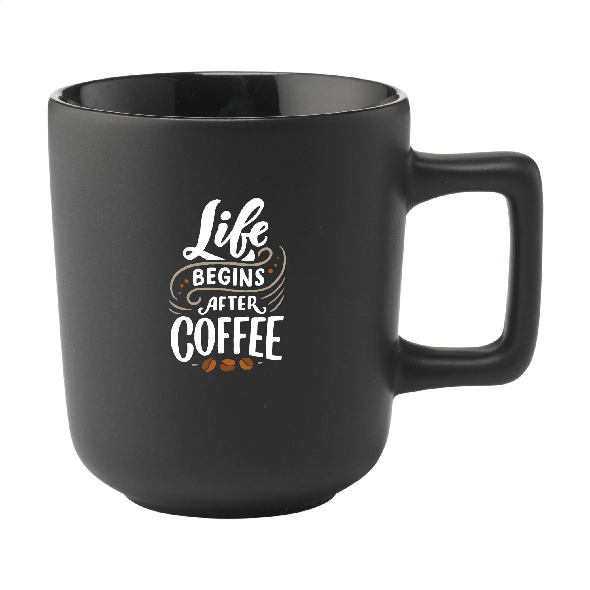 High-quality ceramic mug with a striking handle. Finished with a matte exterior and a high-gloss interior. Dishwasher-safe. The imprint is tested and certified dishwasher-safe: EN 12875-2. Capacity 280 ml. NOTE: The white mug cannot be laser engraved because it is not sufficiently visible.