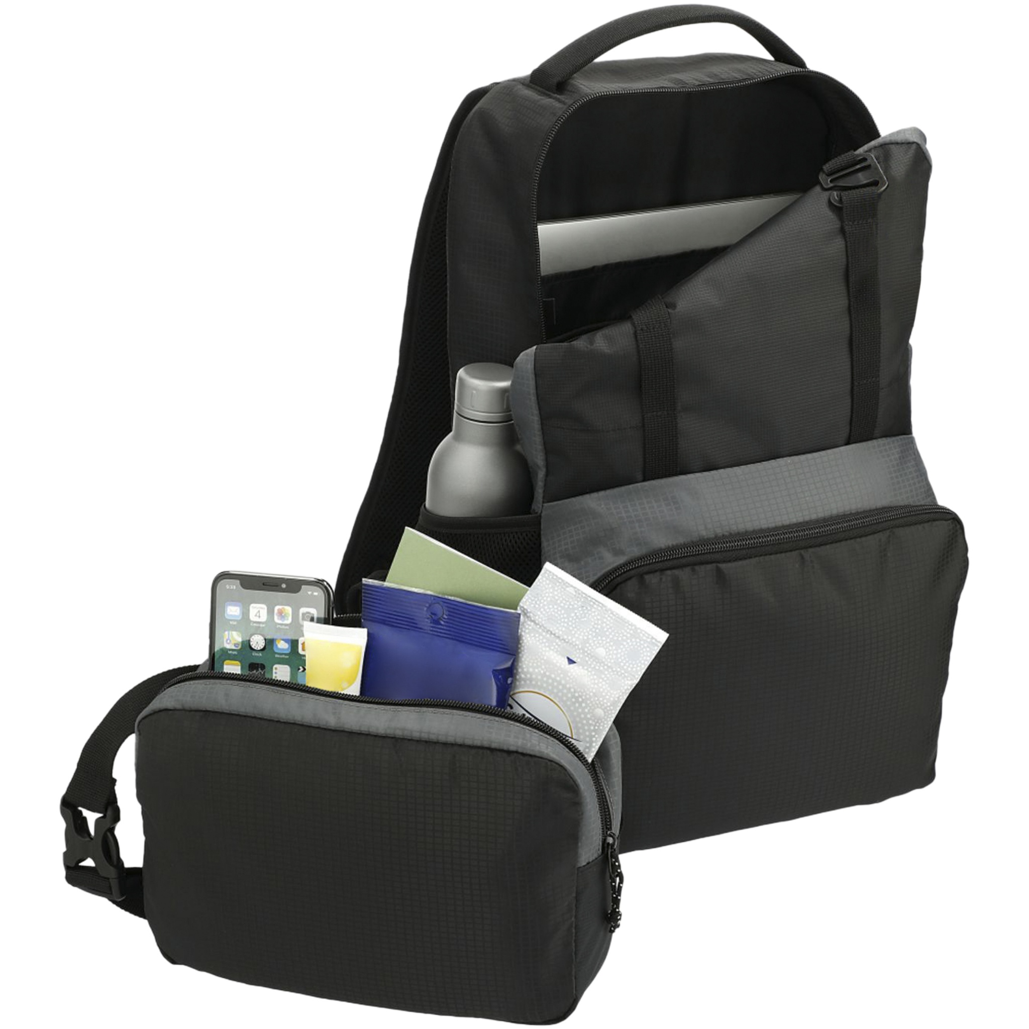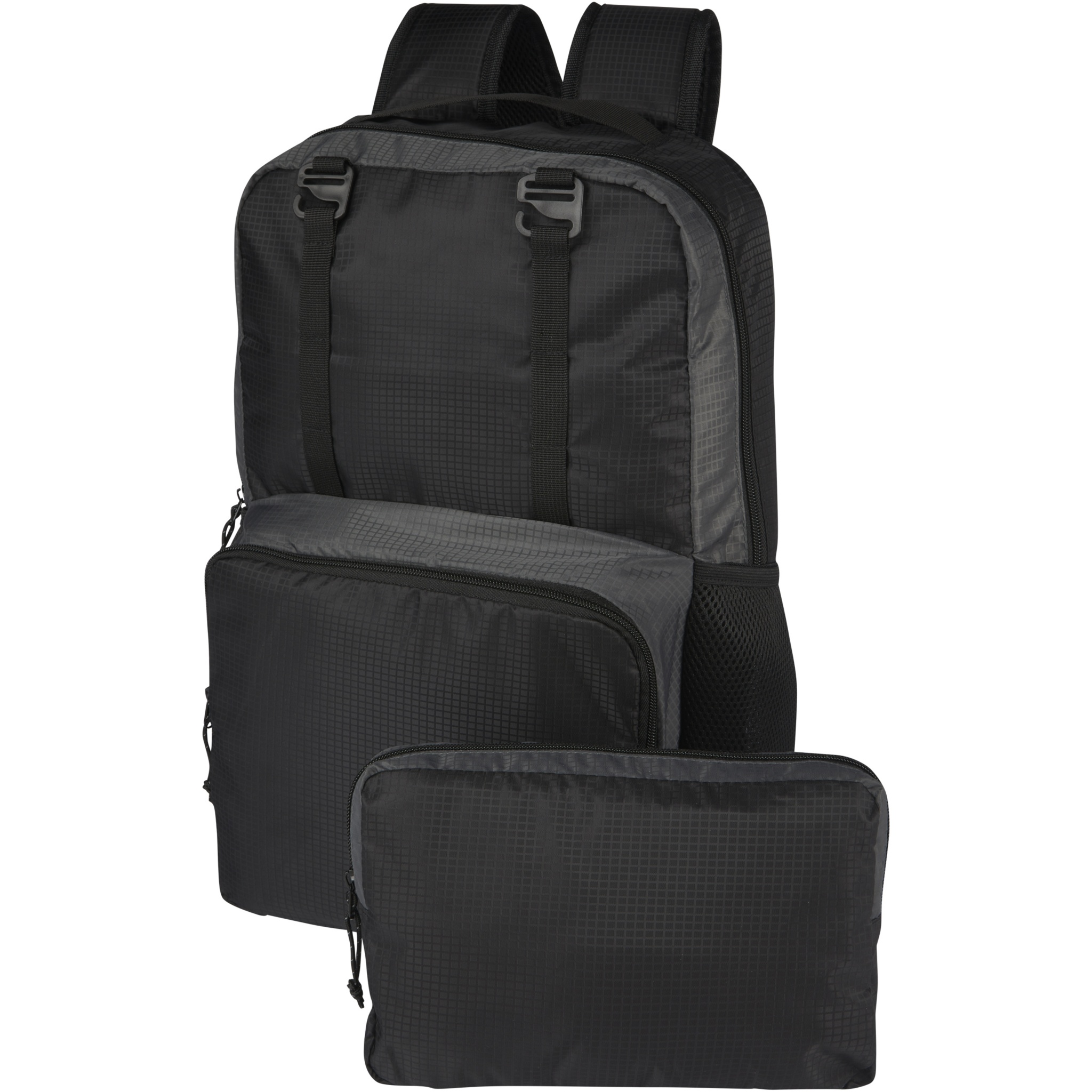 Made with GRS recycled and water repellent fabric and also GRS recycled lining, the Trailhead 14 litre backpack offers top-notch versatility, with a removeable zippered waist pack attached to the front of the bag for a quick grab-and-go accessory. It also has a front pocket with an organizational panel for extra storage, two mesh water bottle pockets, and padded and adjustable shoulder straps for carrying comfort. The backpack also features an on-trend grid pattern making it stand out even further.