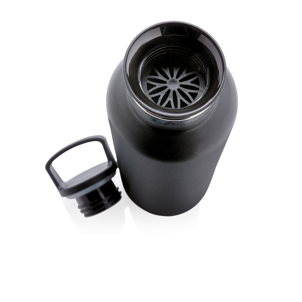 Powder coated double wall vacuum insulated bottle. 2-in-1 lid with filter, perfect for hot tea or infused water. Standard mouth opening, ideal for sipping and adding ice cubes. Built to last, great bottle for any season. 304 SS inner and 201 SS outer keeps your drinks hot for up to 5h and cold for up to 15h. Content: 600ml.