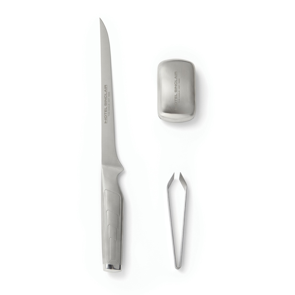 Fillet knife made of high quality Japanese 420J steel. The fillet knife has a long, thin and flexible blade - perfect for precise cuts. You can use the knife for filleting fish or carving ham for example.The set comes with metal soap that removes odours such as fish and garlic. The box also includes a tweezer to remove small bones from fish. The perfect gift for cooking enthusiasts.