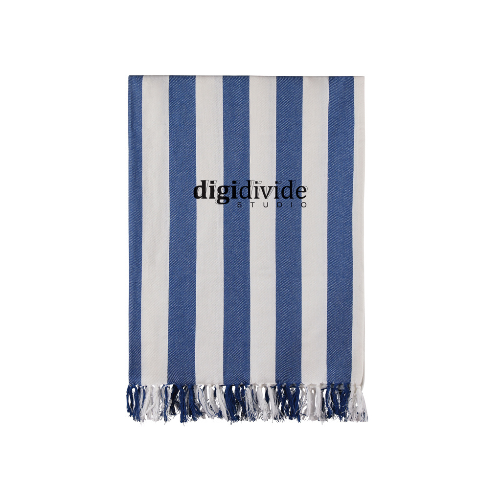 This hammam beach towel features a classic two-coloured striped pattern with fringes on the short sides. Crafted from a lightweight and airy 200 gsm blend, it combines the comfort of cotton with the quick-drying benefits of polyester. Measuring 80x180 cm, it is perfect for the beach or poolside. Certified by GRS (Global Recycled Standard), GRS certification guarantees that the entire supply chain of the recycled materials is certified. The total recycled content is based on the overall product weight. This product contains 68% GRS certified recycled cotton and 29% GRS certified recycled polyester.