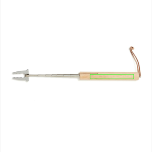 The grill stick is perfect for use over an open fire. The grill stick can be extended by means of a telescopic handle. Barbed fork and wooden handle. The barbs of the fork are designed so that what you are grilling is firmly attached to the stick, preventing food from getting into the grill or fire. Practical leather cord for hanging up. Extended length: approx. 70 cm.