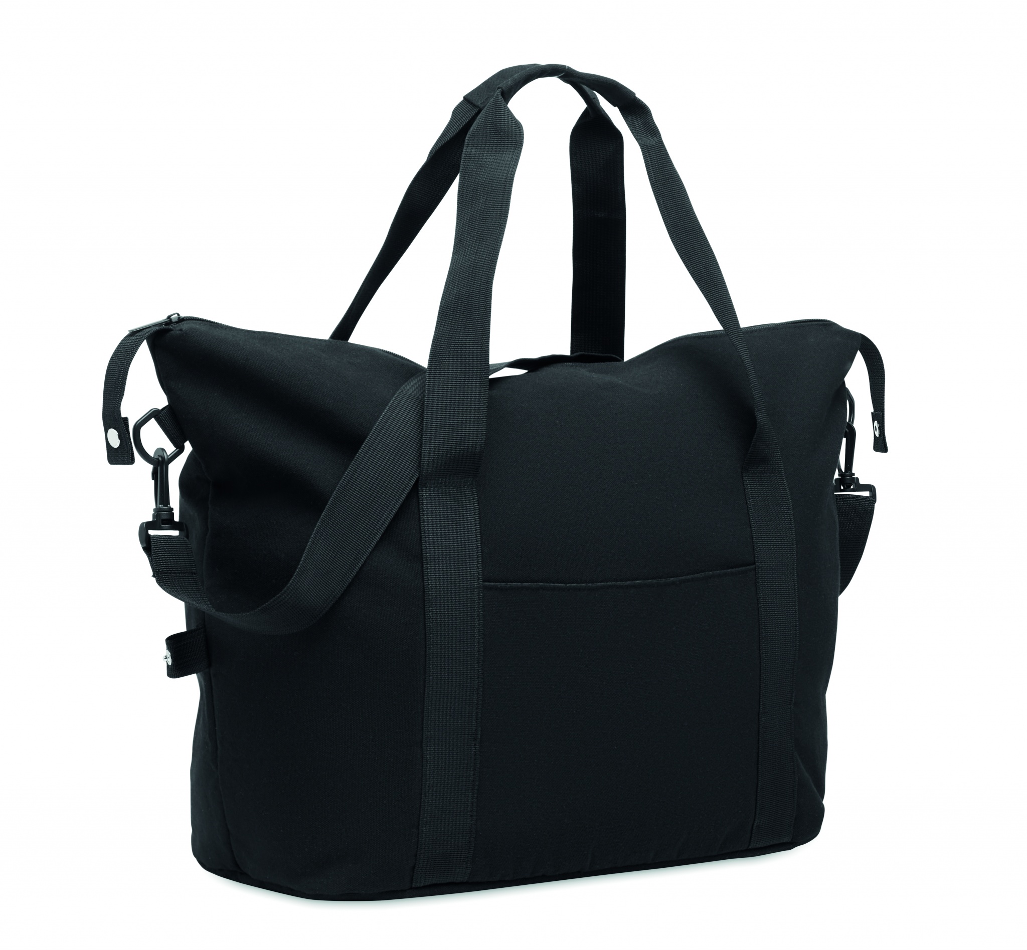 Weekend bag in recycled pre-consumer cotton and recycled polyester (70%/30%) with lining 210D RPET polyester. It has a front slip pocket, zippered back pocket a removable and adjustable shoulder strap and padded bottom. Trolley holder on reverse side.