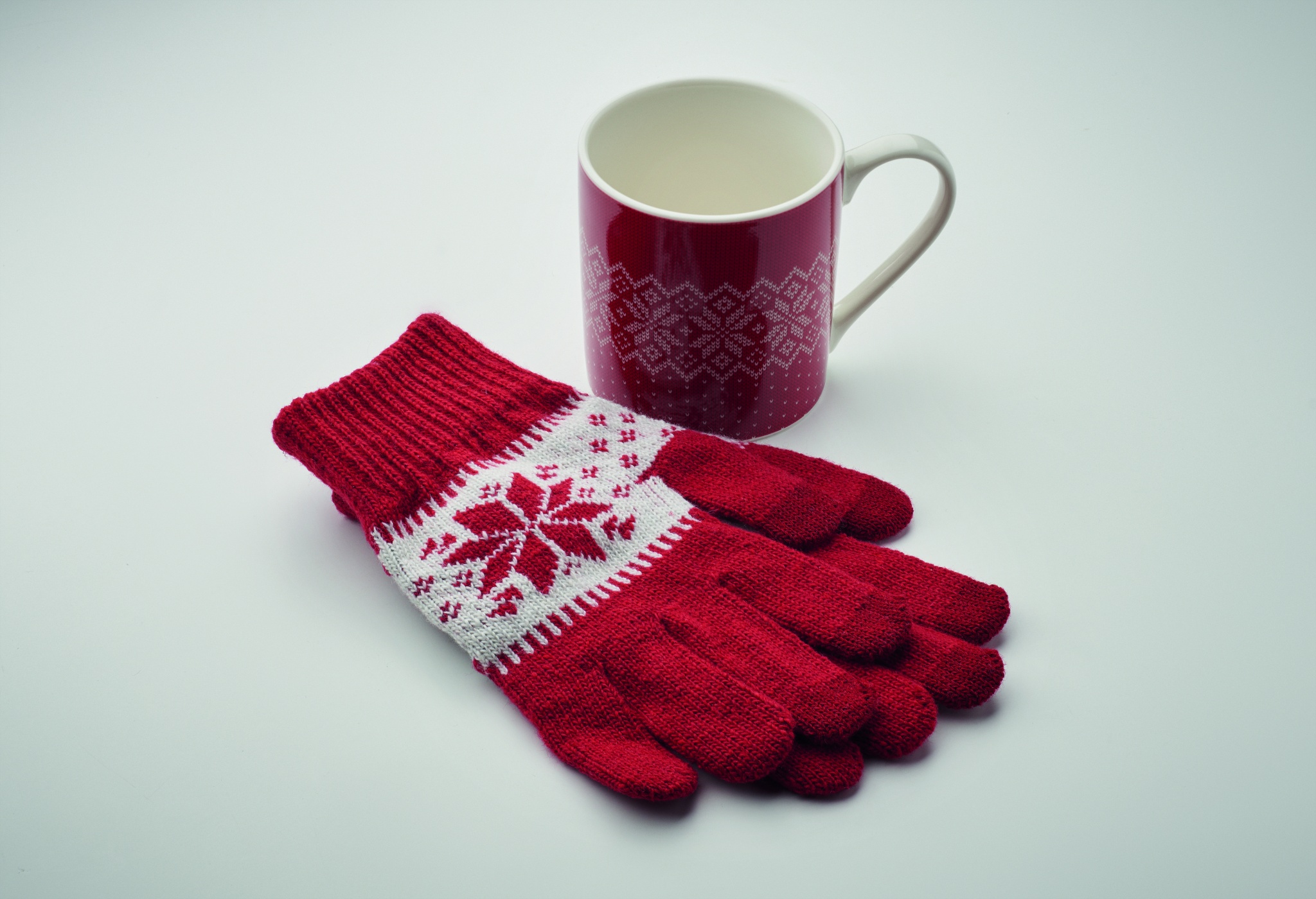 Winter gift set including a touch screen knitted tactile gloves with a snowflake pattern and a ceramic mug. Capacity: 300 ml. Presented in a matching box.