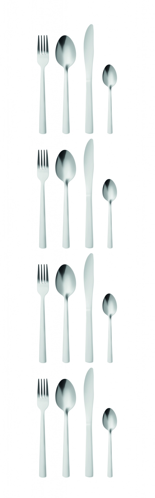 16-osaline roostevabast terasest söögiriistade komplekt 4 lauakomplekti jaoks. Sealhulgas: teelusikas, supilusikas, kahvel, nuga. Esitatakse jõupaberikarbis.