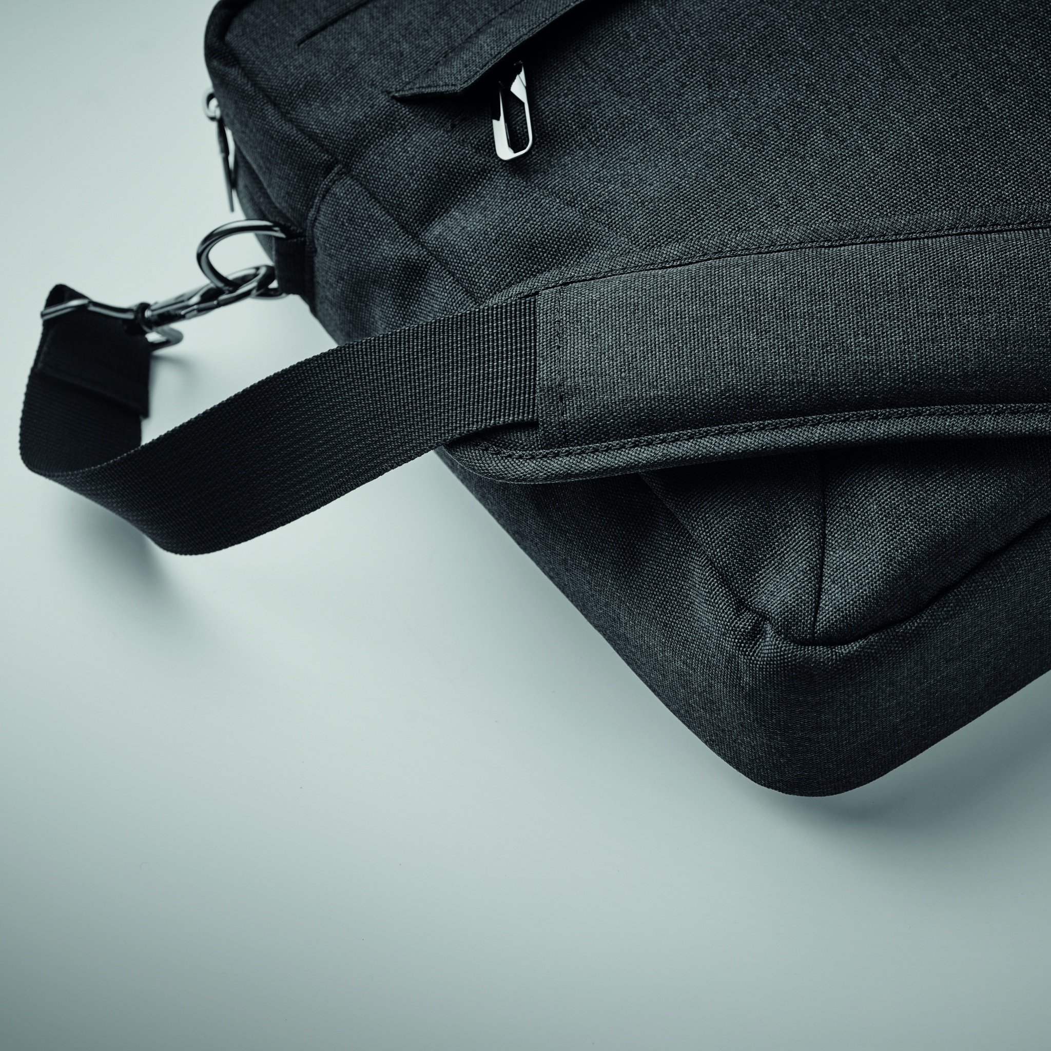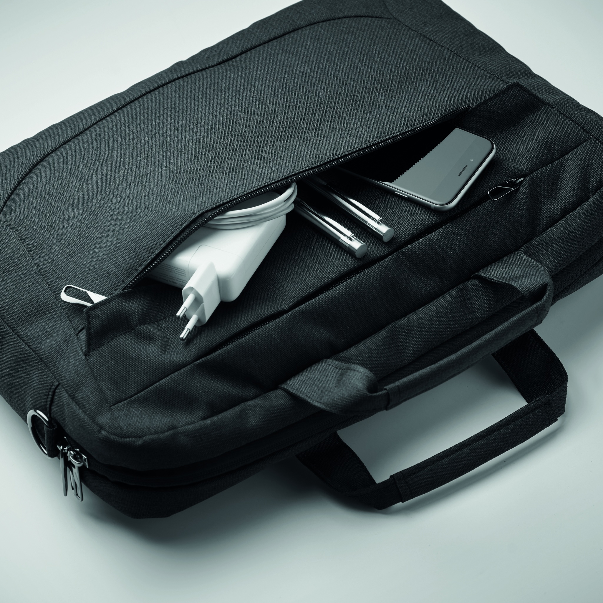 15-tolline sülearvutikott 600D RPET polüestrist. 2 peamist sisemist sahtlit nii sülearvuti kui tahvelarvuti ja suure lukuga esitasku jaoks. Sellel on väike lukuga tasku. Eemaldatavad ja reguleeritavad õlarihmad. Käru hoidik tagaküljel.