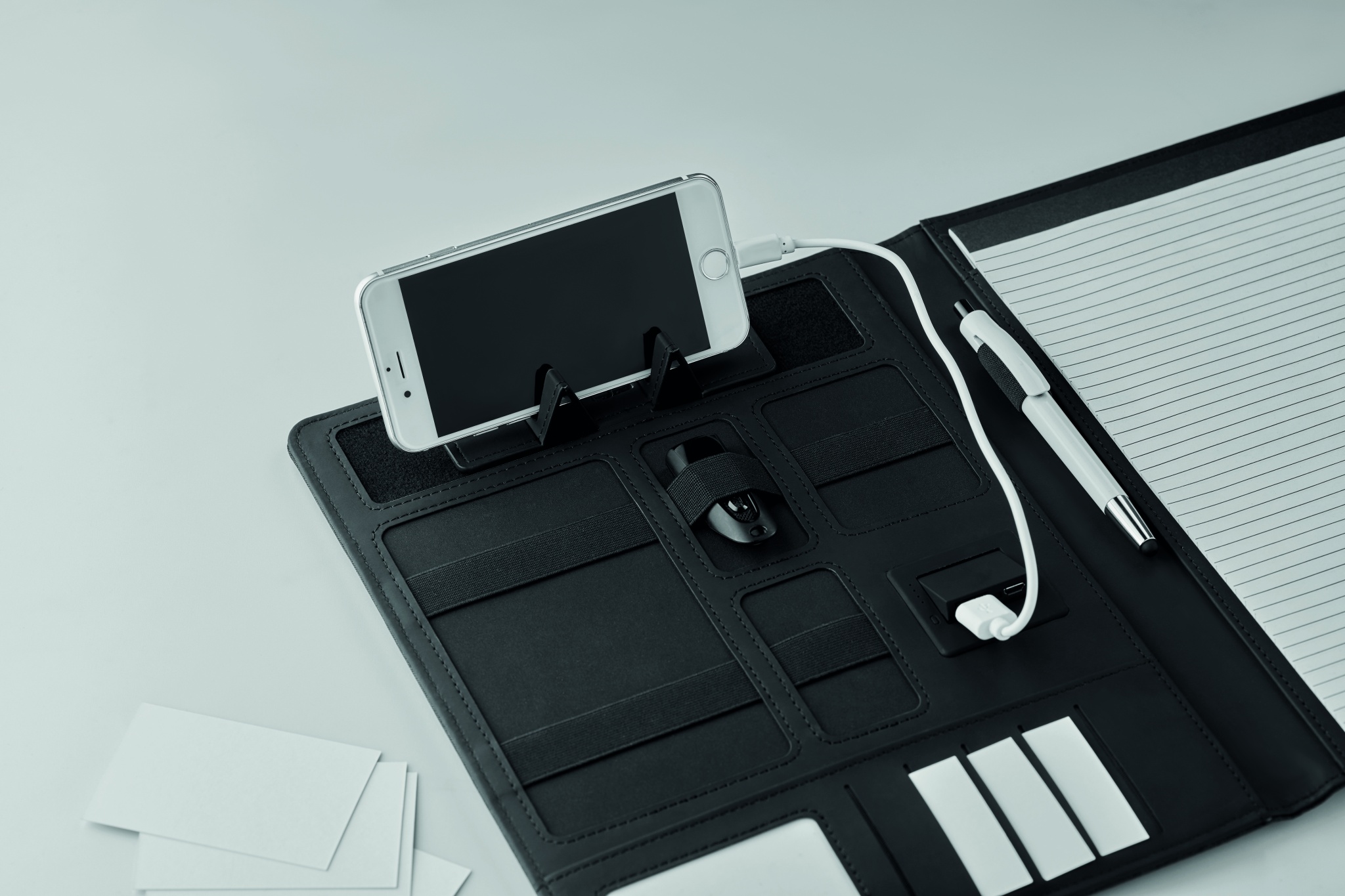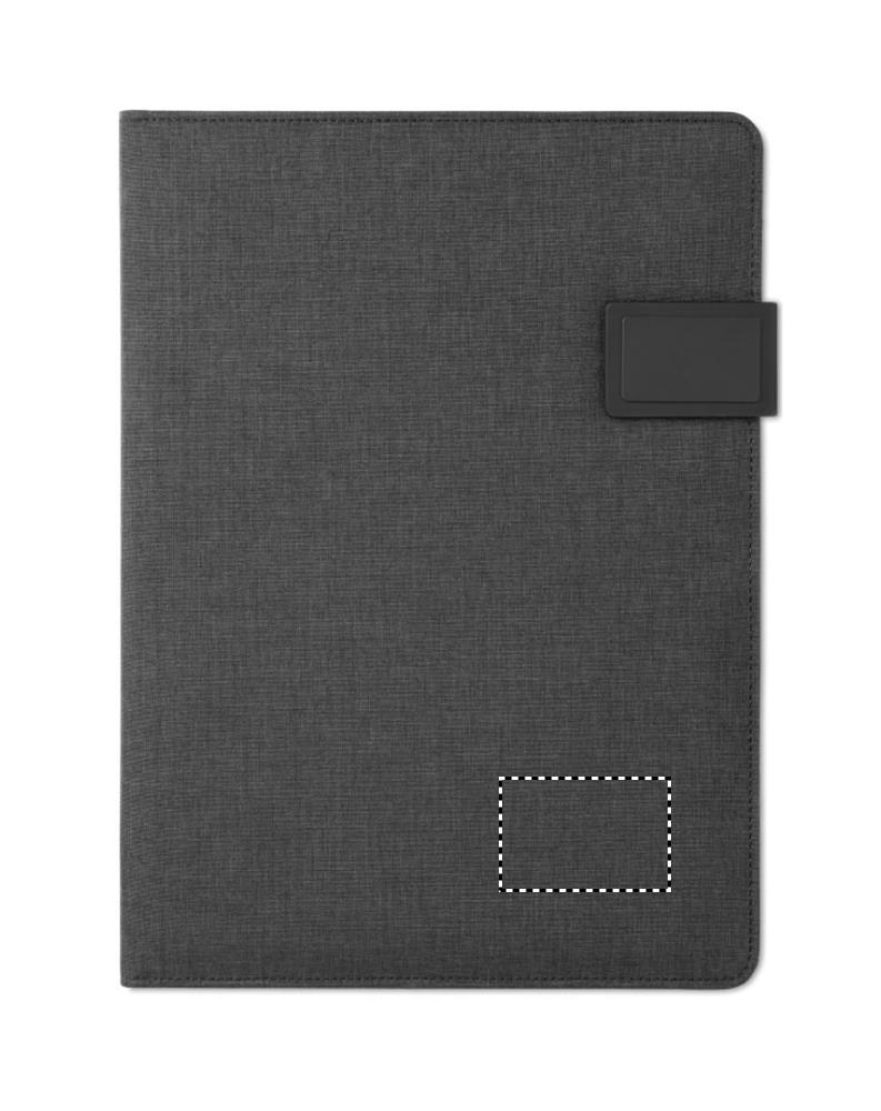 A4 konverentsimapp PU-nahast kaantega. Kaasas 4000 mAh akupank. Sisseehitatud mikro-USB C-tüüpi pistik, 20 joonelise lehega märkmik, mitu sisemist sektsiooni, magnetiline sulgur, elastne pliiatsihoidja.