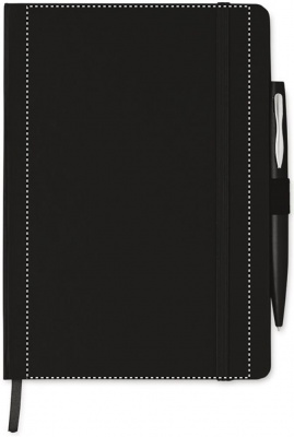 A5 märkmik koos pastakaga. Kõvakaaneline, sees 144 joonelist lehte. Sobiv elastne sulgemisrihm, lindiga järjehoidja ja pliiatsihoidja. Stiilne metallist detailidega pastapliiats. Sinine tint.