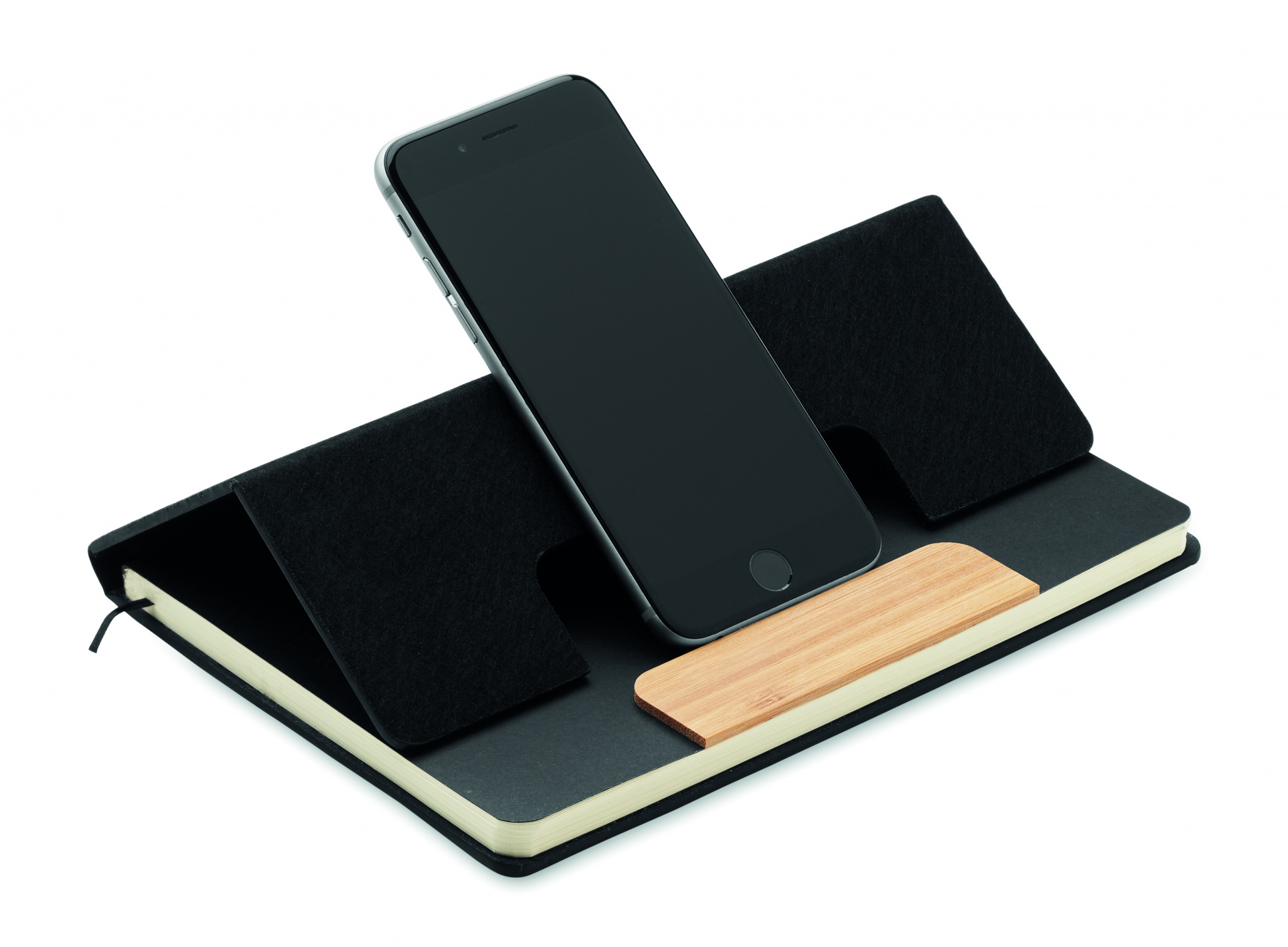 A5 RPET vildist kõvakaaneline sülearvutikomplekt telefonialuse funktsionaalsusega ja bambusest tünniga tõukuriga pastakaga. Juhtum köidetud. 160 taaskasutatud paberist joonitud lehte (80 lehte). Elastne sulgemisrihm. Lindi järjehoidja. Sinine tint.
