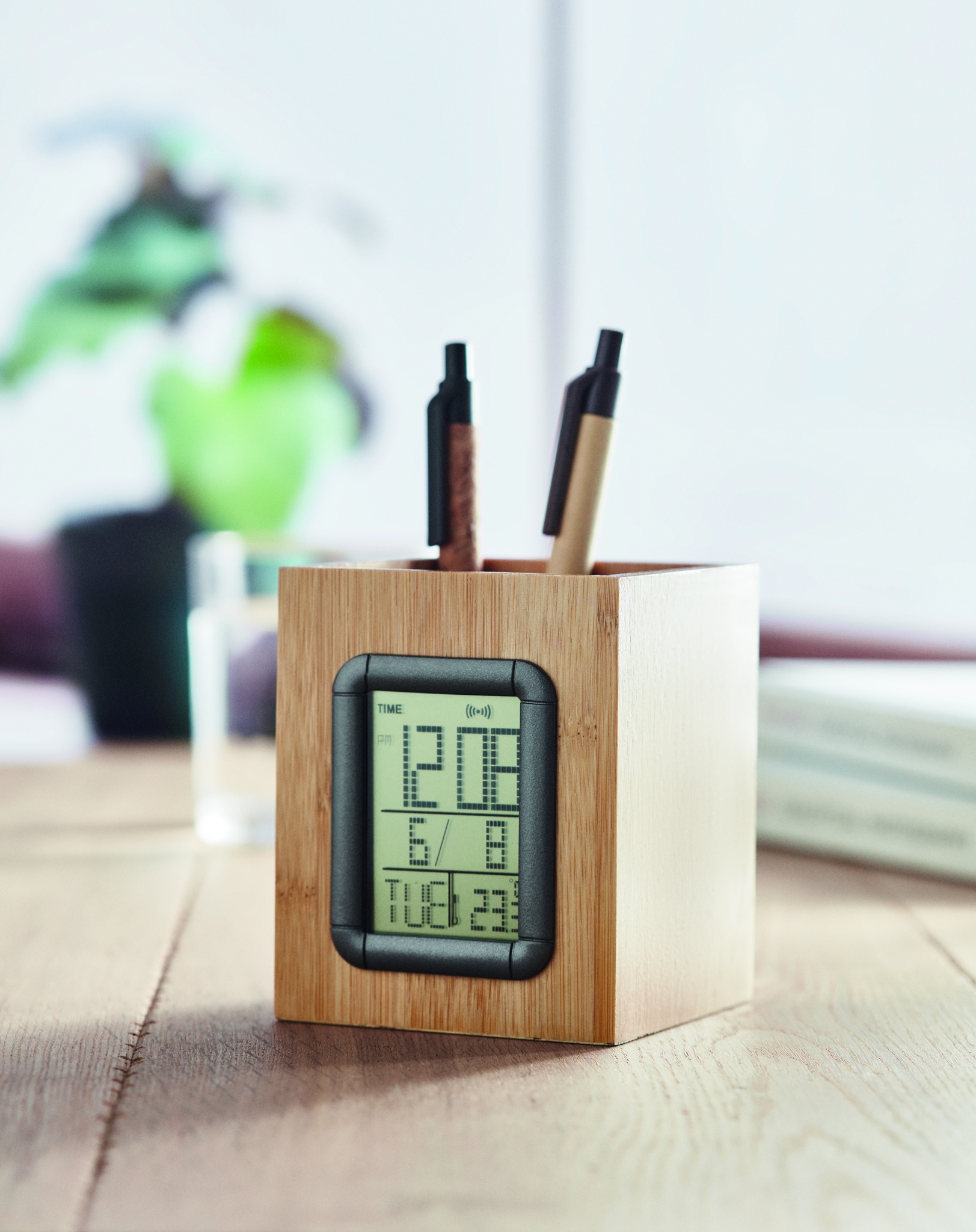 Logo trade reklaamtoote pilt: Bambusest pliiatsihoidja ja LCD kell