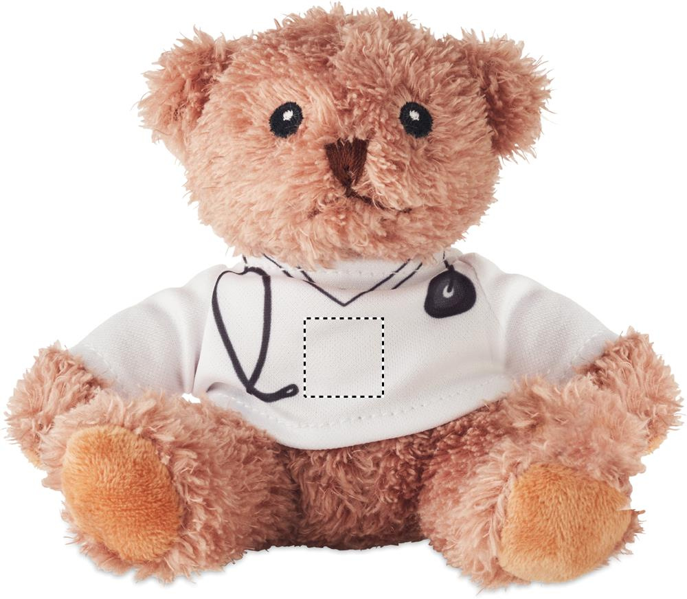 Polüester plüüsist kaisukaru, kes on riietatud arstiks ja kellel on valge trükitud T-särk. Tikitud silmad, nina ja suu.