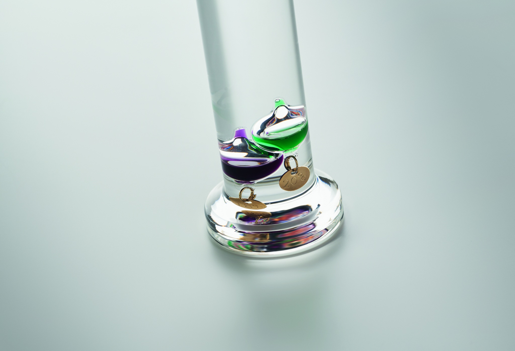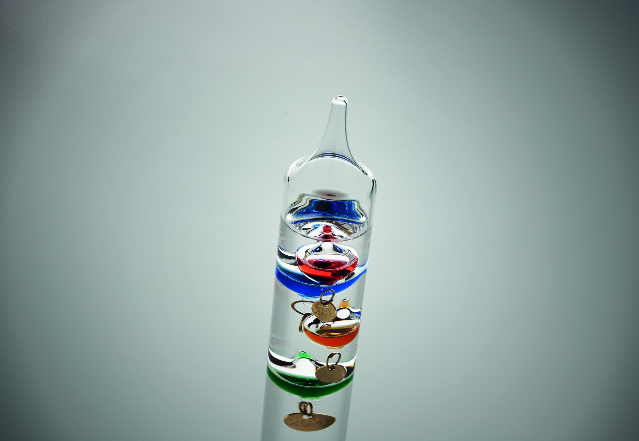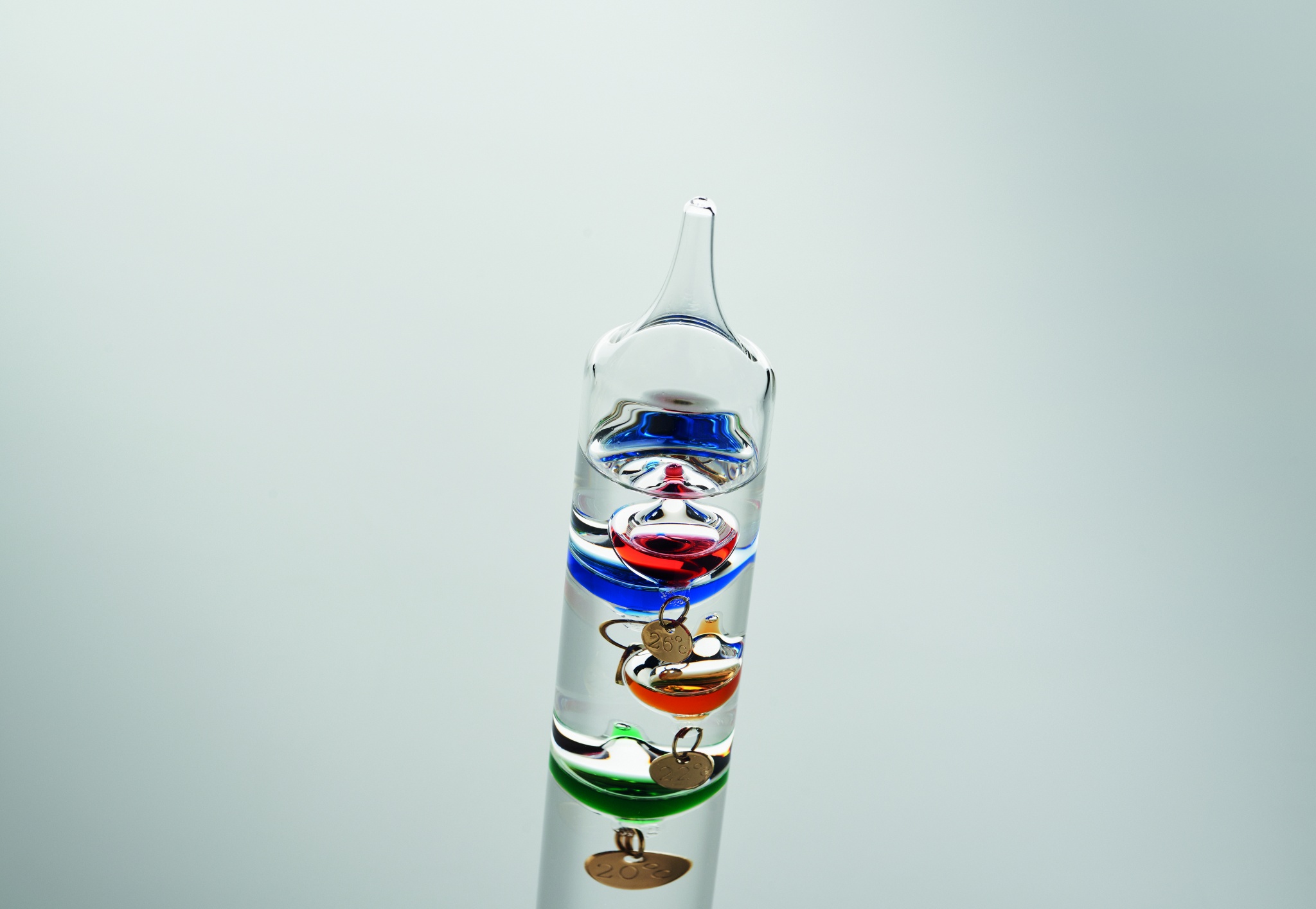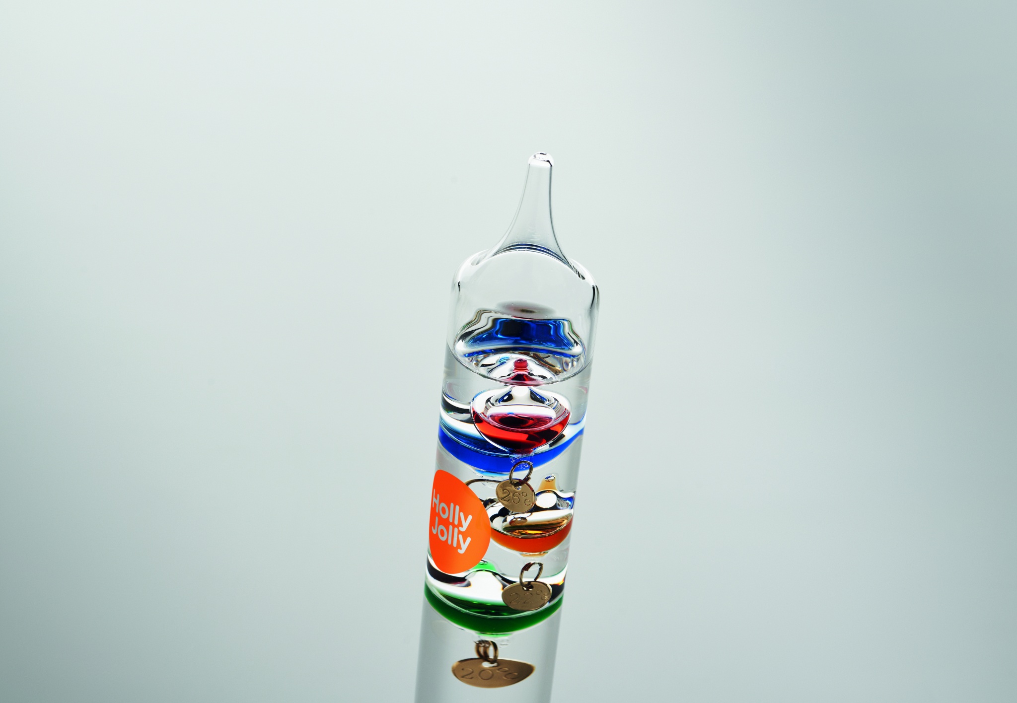 Galileo klaasist termomeeter viie värvilise hõljuva gloobusega. Iga maakera näitab temperatuuri vahemikus 18°C kuni 26°: punane 26°, kuninglik sinine 24°, oranž 22°, roheline 20° ja lilla 18°. Ülemise rühma madalaim sfäär näitab ümbritseva õhu temperatuuri.