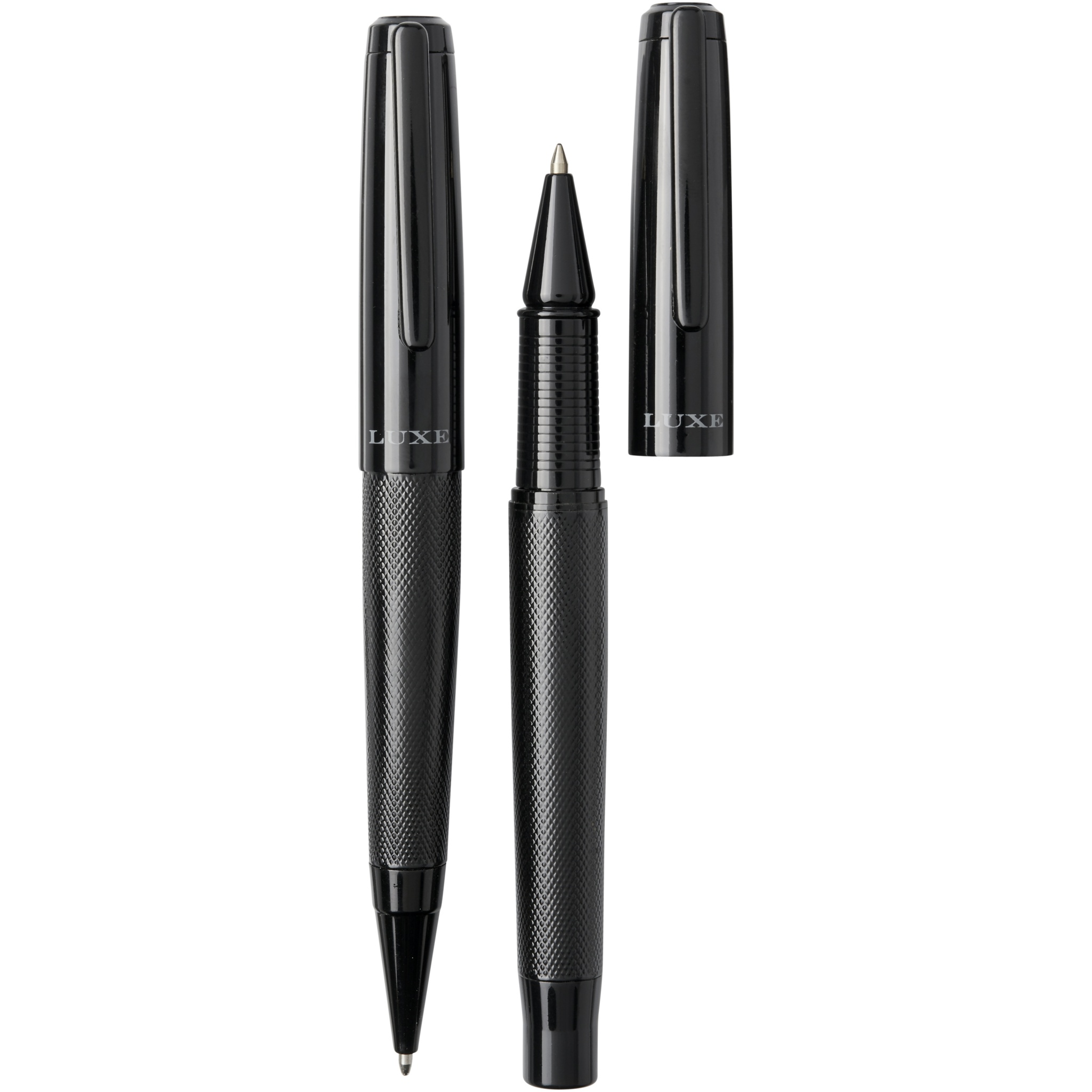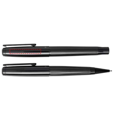 Pastapliiatsi ja rullpliiatsi kinkekomplekt musta ülemise ja alumise silindriga, läikiva viimistlusega, tarnitakse Luxe kinkekarbis. Pastapliiats: 14 cm x 1,45 cm, kaal: 40 gr, kirjutuspikkus: 800 m. Rullpliiats: 13,8 cm x 1,45 cm, kaal: 54 gr, kirjutuspikkus: 400 m.