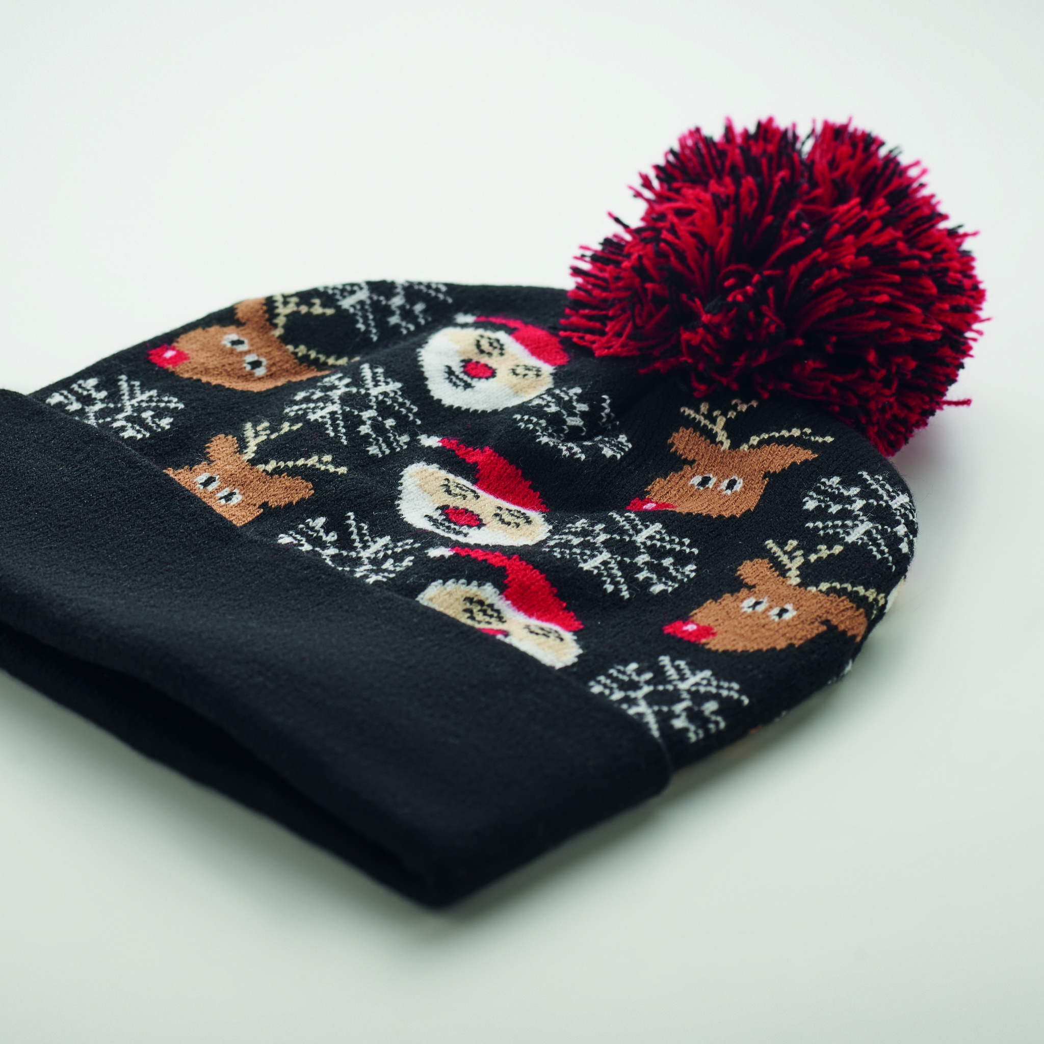 Pehmest venitavast akrüülist jõuludeks kootud müts manseti ja tupsuga.