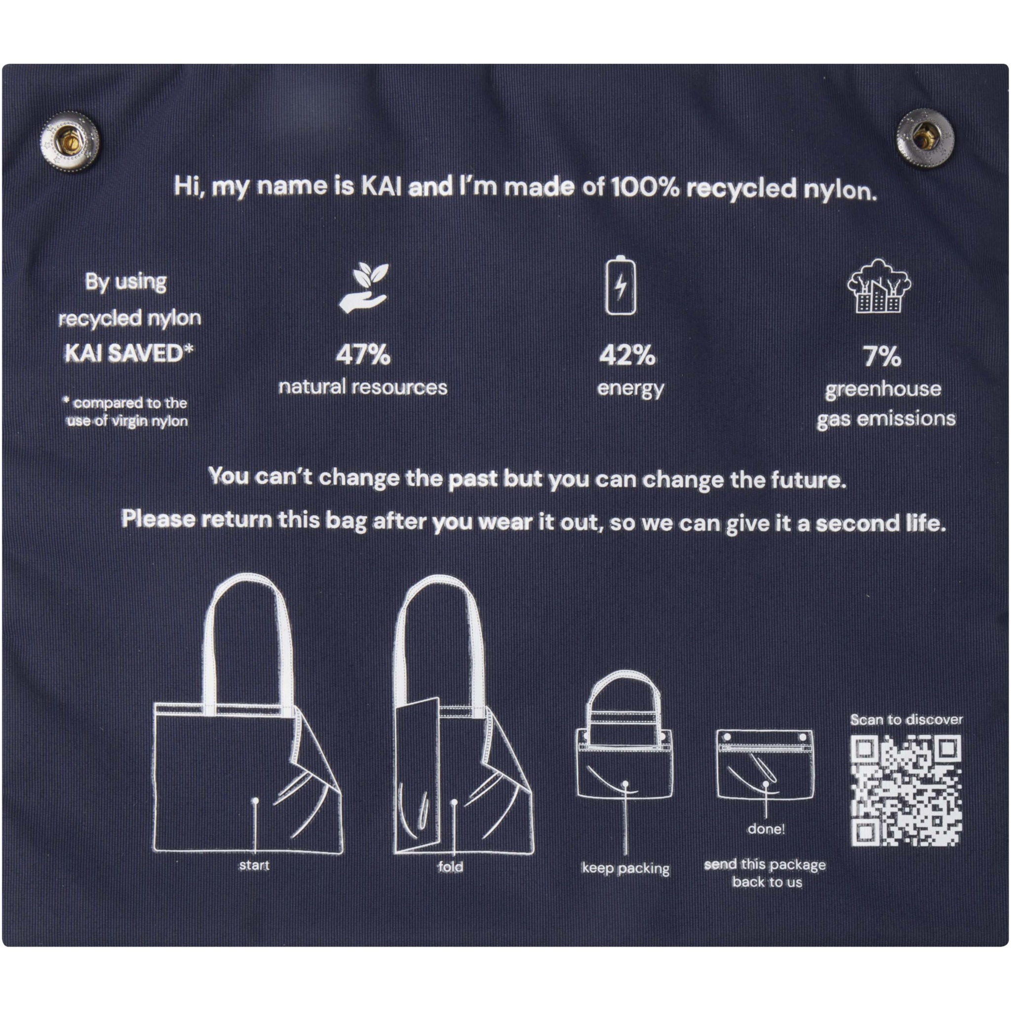 Kai GRS-i taaskasutatud ümmargune kandekott – keskkonnasõbralikkuse seisukohalt suurim positiivse mõju tegija. Säästvam uurimine algab paremast disainist – disainist, mis mõjutab keskkonda vähem. Juba 1 kotiga tehtud keskmine mõju vähenemine kokku on järgmine: 7% süsiniku jalajälg, 42% energia ja 47% ökokulud. 200T GRS sertifikaadiga taaskasutatud nailonist valmistatud Kai on klassikaline ja ajatu kandekott, mis sobib igapäevaseks kasutamiseks. Trükkimiseks määratud koht on taskul, mis toimib ka kotina. Koti saab tagastada tagasivõtuprogrammi kaudu, millel on QR-kood, mis annab lisateavet.