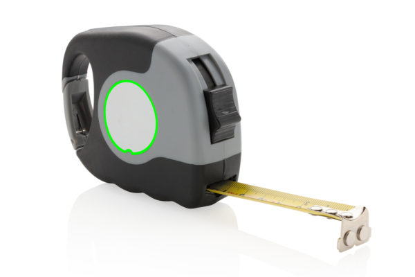 5M/19mm mõõdulint, karabiiniga, hall ABS ümbris musta TPR käepidemega, must vööklamber, must iselukustuv nupp, must otsakonks 2 tugeva magnetiga, kollane lint, matt hõbedane PVC kleebis. Registreeritud disain®