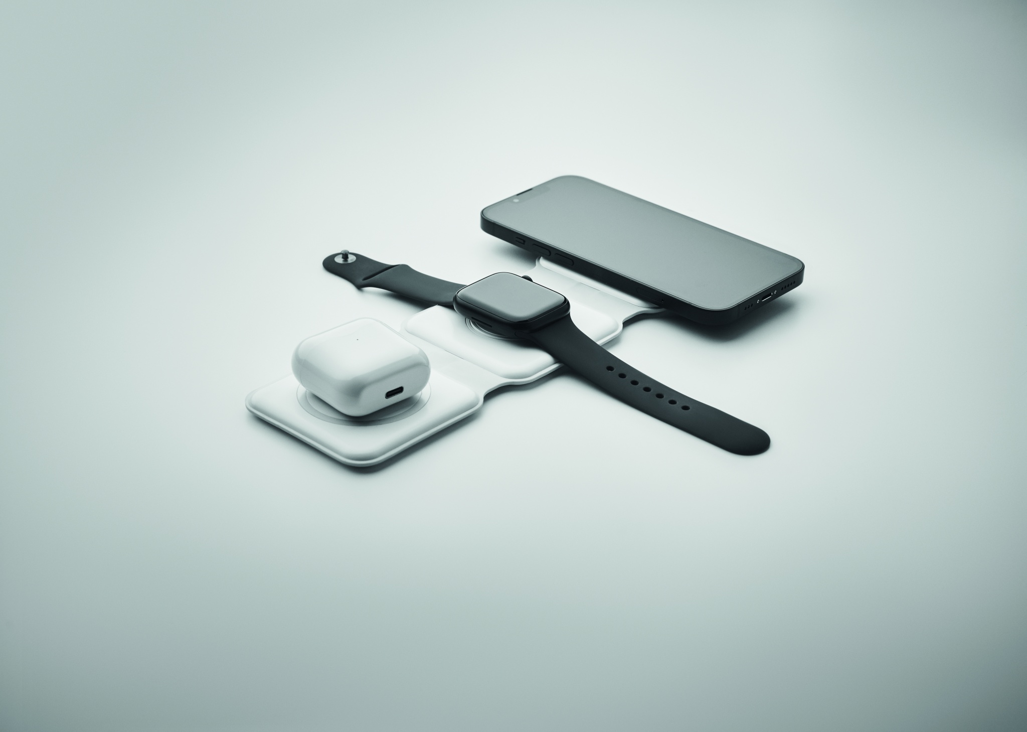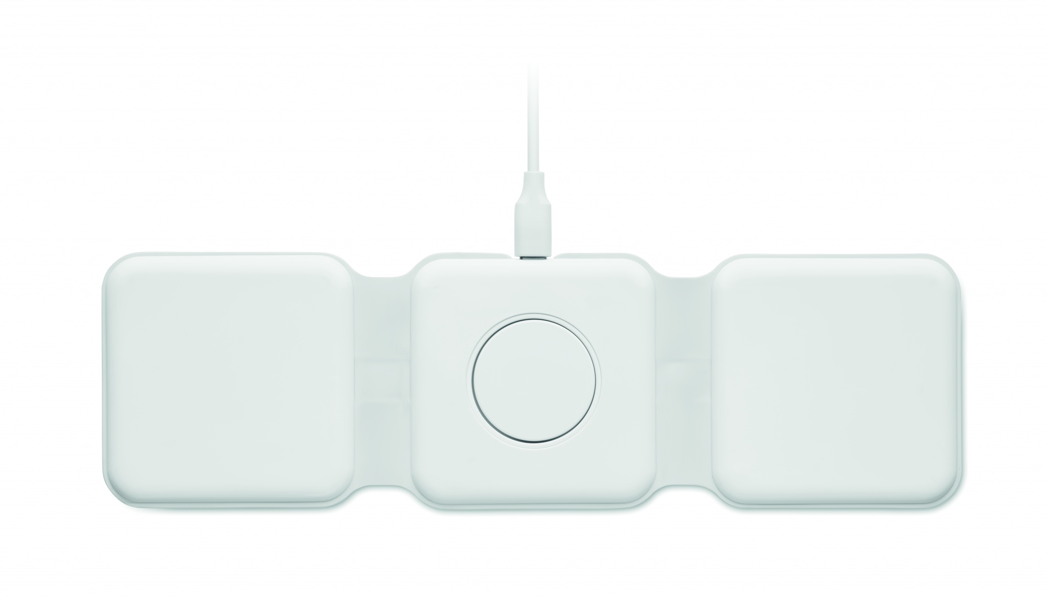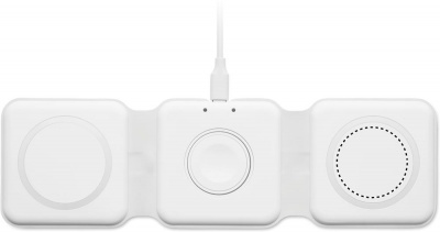Kolm-ühes kokkupandav ABS-laadimisjaam. Sellel on 3 juhtmevaba laadimiskohta (15 W). Sisend: 2-in-1 Type-C ja Type-A. Ühildub kõigi QI-toega seadmetega, nagu uusimad Androidid, iPhone® 8, X ja uuemad. Ühildub ka iWatchiga.