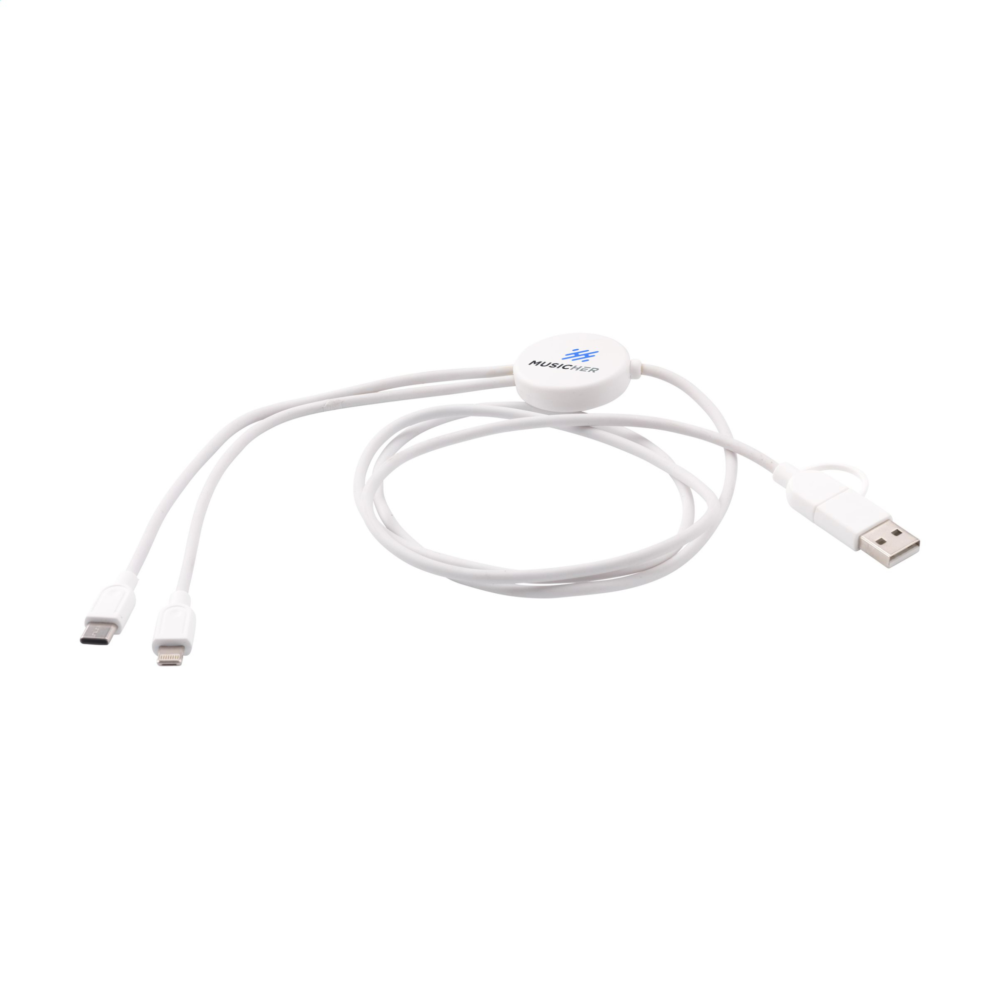 Laadimiskaabel on valmistatud ringlussevõetud ABS-st ja taaskasutatud TPE-st. Sisend: C-tüüpi ja USB-A pistik. Väljund: C-tüüp ja Lightning. RCS-sertifikaadiga. Kokku taaskasutatud materjal: 62%. Kaabli pikkus: 120 cm. Iga ese tarnitakse eraldi ümbrikus.