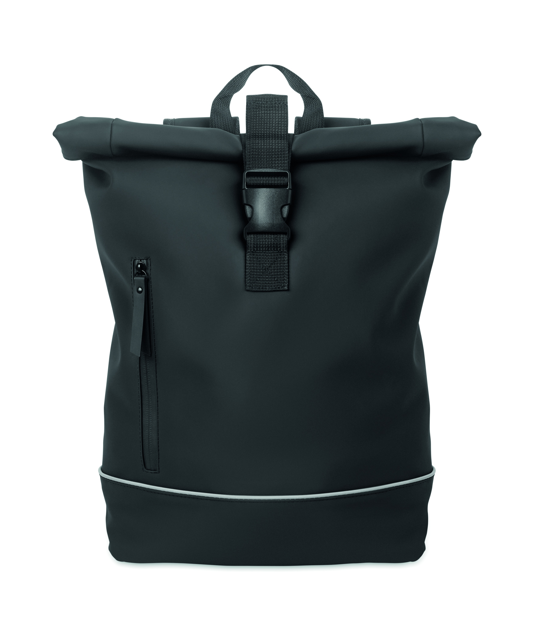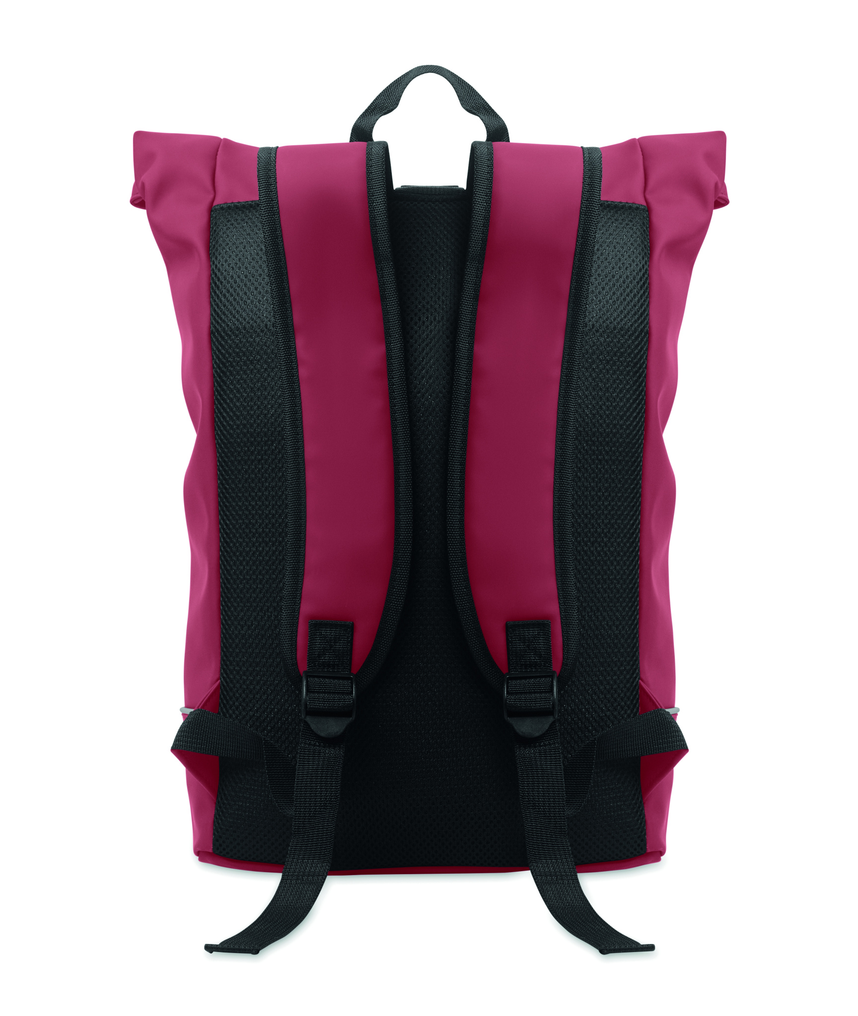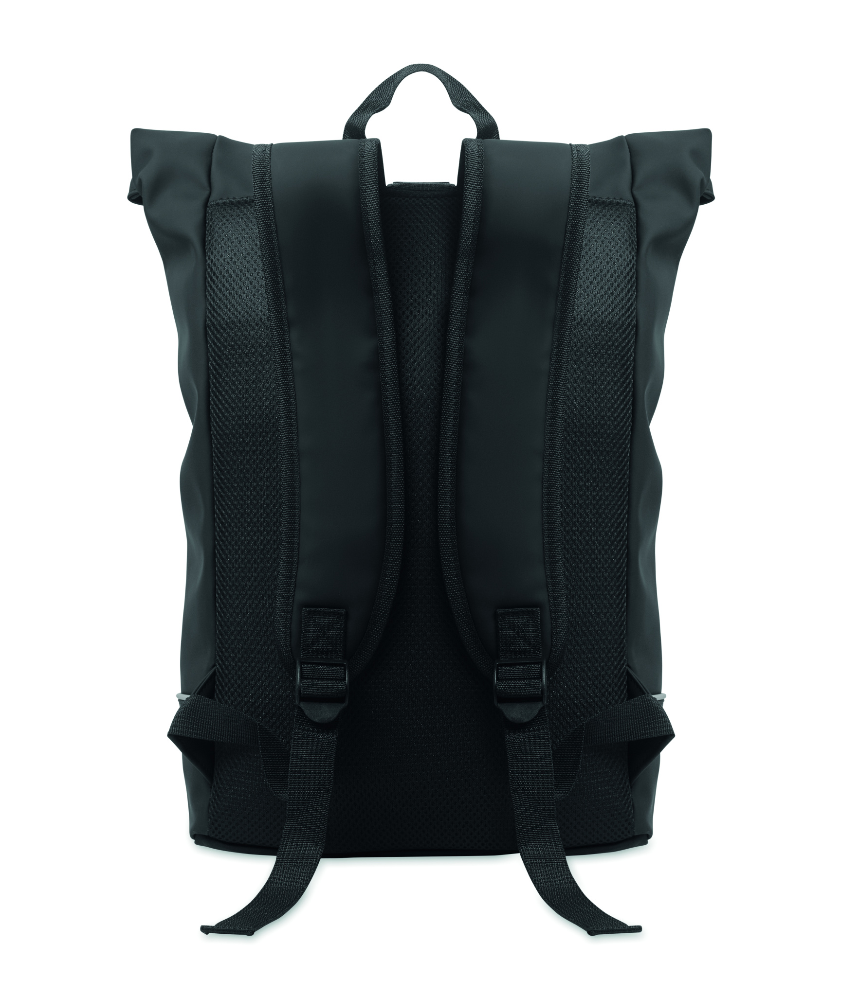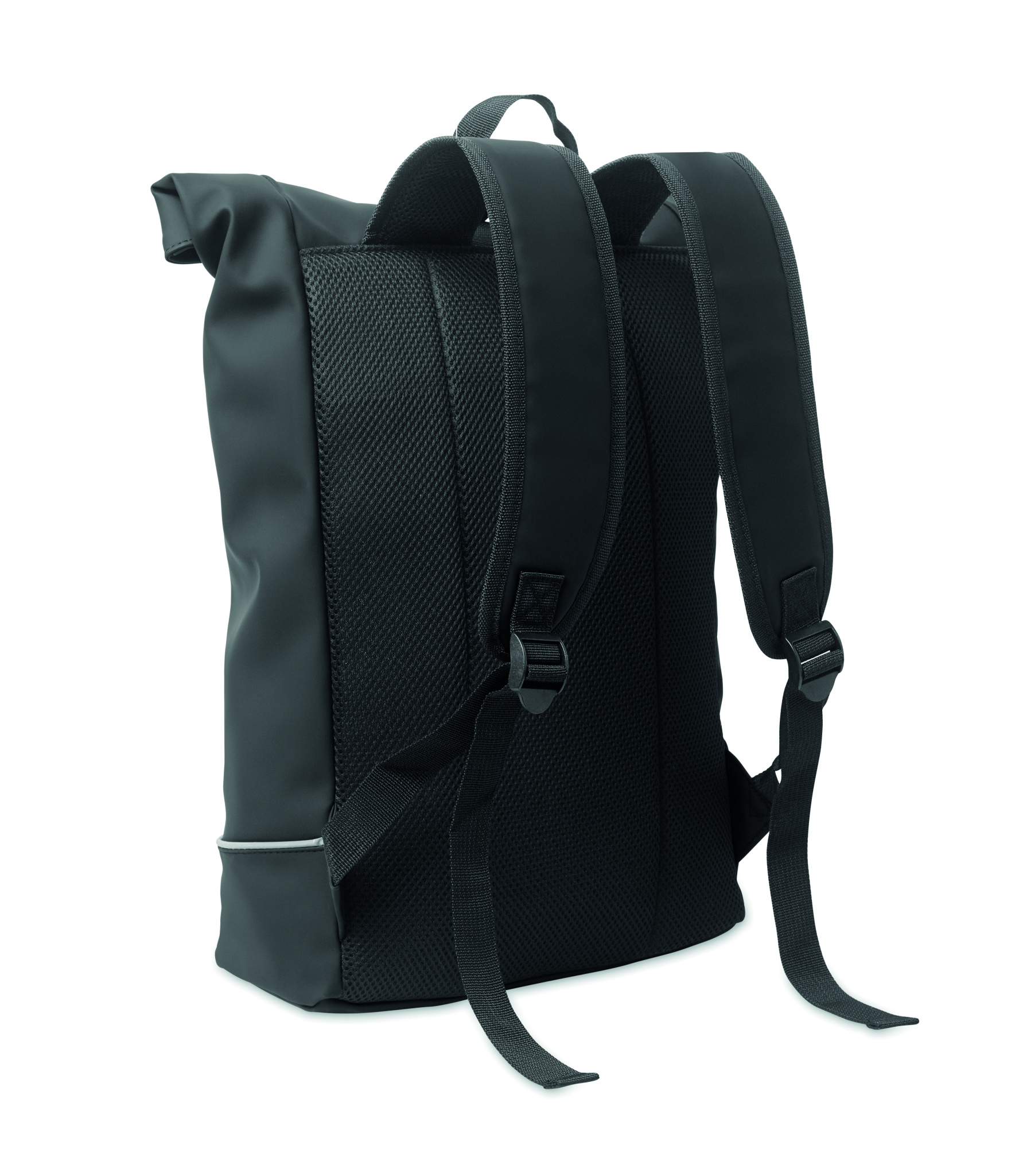 15-tolline rull-top sülearvuti seljakott pehmest PU-st polsterdatud seljaosa ja helkurribaga tugevdatud põhjaga. Veekindel lukuga esitasku. 210D RPET polüestervooder.