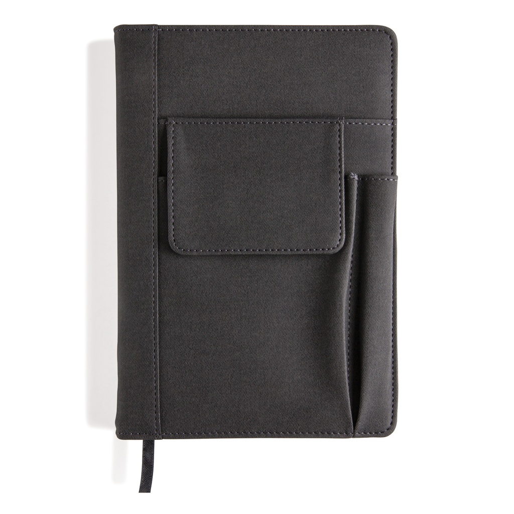 Kaetud polüuretaanist sülearvuti kate eesmise telefonitasku (14 x 10 cm), pliiatsitasku ja ühe põhitaskuga. Must lehejagaja ja sees 160 lehekülge 80g/m2 paberit. Seda märkmikukaant saab lõputult kirjutamiseks uuesti kasutada uue A5-formaadis märkmikupaberiga.