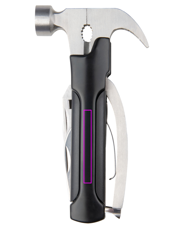 Multifunktsionaalne tööriist (roostevaba teras), mis koosneb haamrist, viilist, kahest labast, saest, pilukruvikeerajast ja pudeliavajast. Kaasas on sobiv ümbris, mille keskele trükime teie logo.