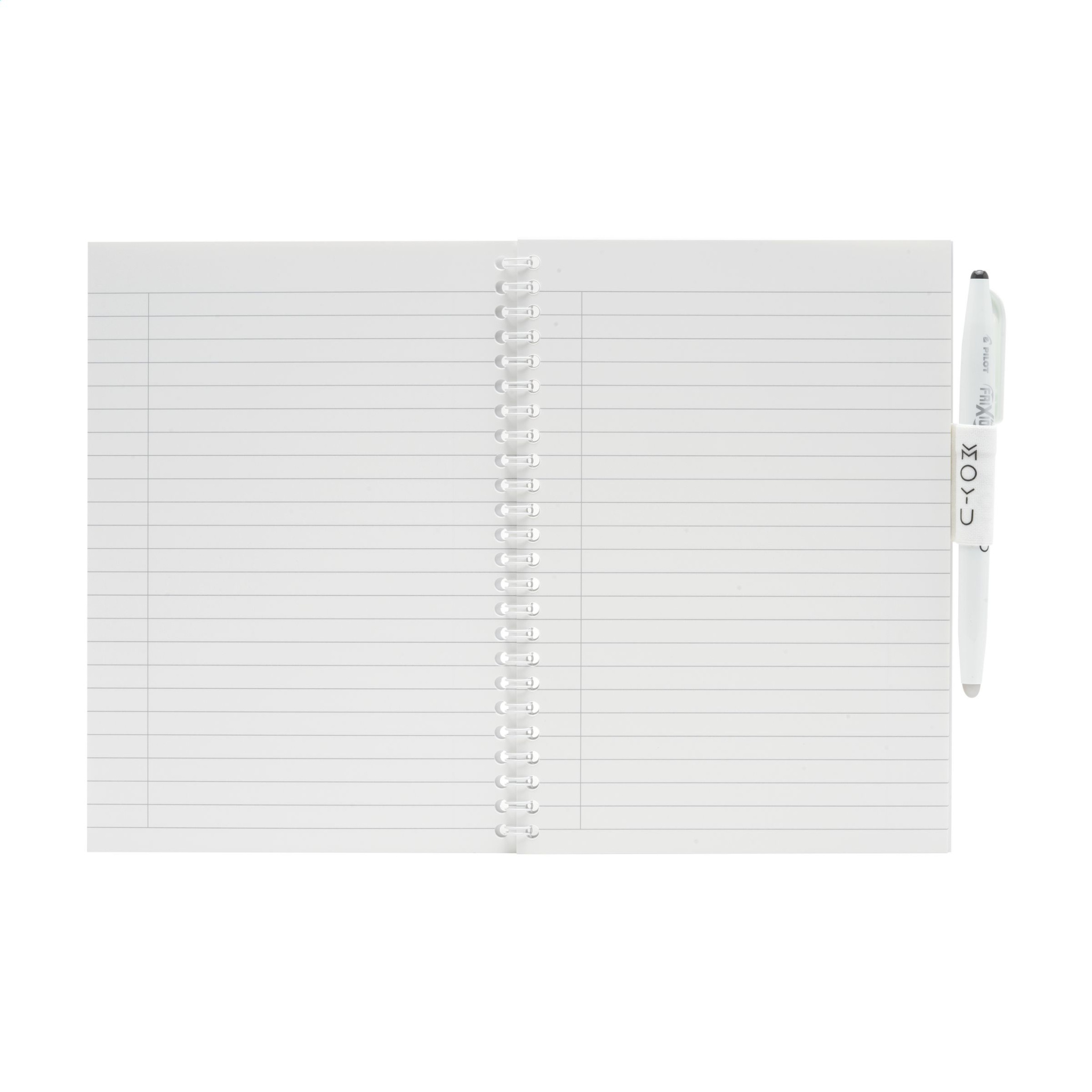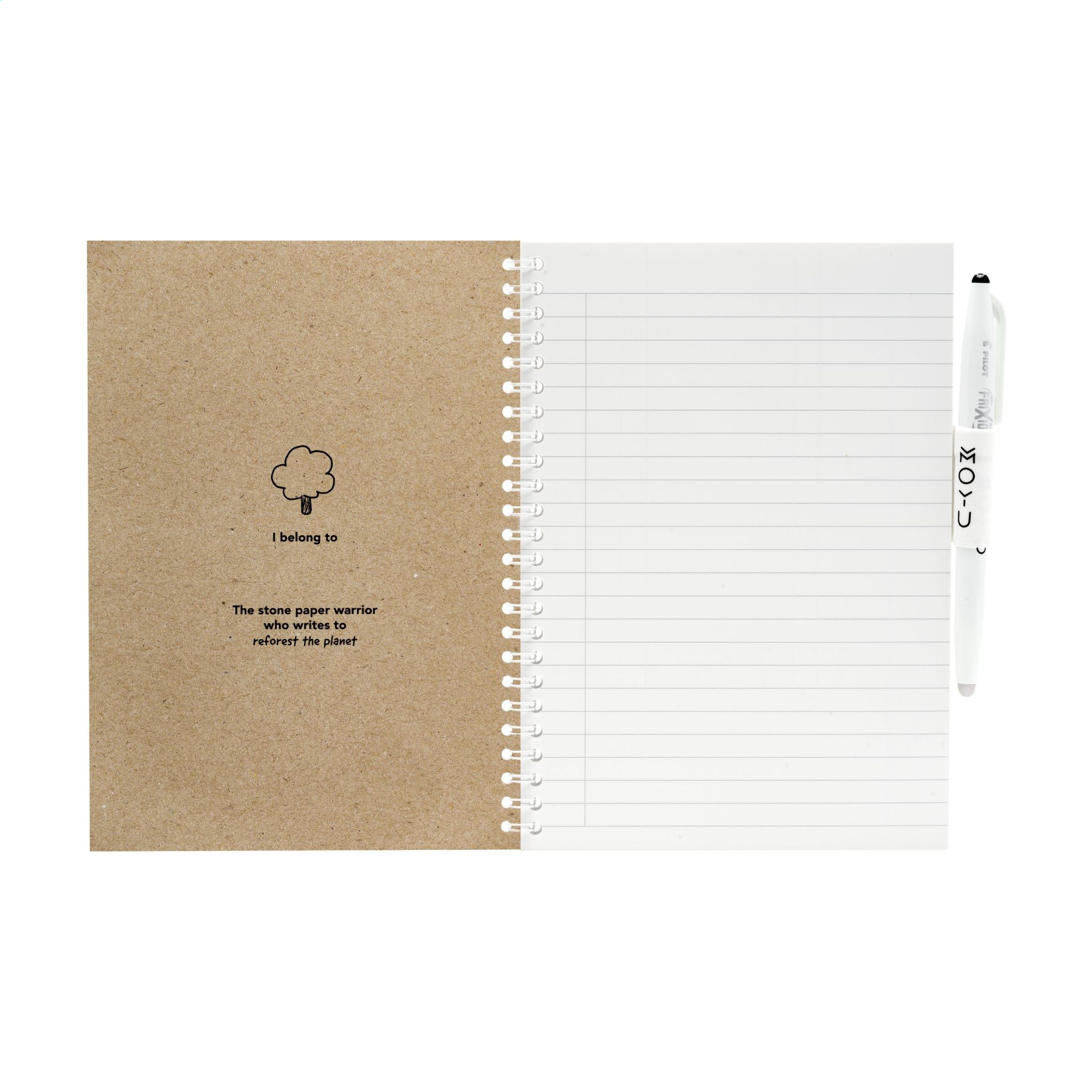 MOYU kaubamärgiga A5 kustutatav kivipaberist märkmik. Tugev kate on valmistatud 440 grammisest taaskasutatud jõupapist. See märkmik sisaldab pliiatsit ja puhastuslappi. Iga kivipaberileht on jätkusuutlikult toodetud, looduslikult puuvaba ja 100% taaskasutatav. See elastse pliiatsiaasaga märkmik on köidetud tugevasse traat-o-köites ja sellel on 18-leheküljeline jooneline paber. Tehke märkmeid kaasasoleva spetsiaalse MOYU pliiatsiga. See pliiats sisaldab originaalset Frixioni tinti. See spetsiaalne tint kuivab täielikult kivipaberil ja seda on lihtne kustutada ilma jälgi jätmata. Niisutage kaasasolevat MOYU lappi veidi veega ja kustutage tint. Nii jäävad leheküljed uute ideede ja ülesannete nimekirjade jaoks tühjaks. Kivipaberile saab kirjutada keskmiselt 500 korda. See märkmik kestab teile aastaid. Kivipaber on valmistatud 80% lubjakivist ja 20% puhtast plastikust. See on loomulikult puudevaba ja selle valmistamiseks pole vaja vett ega kemikaale. Kivipaberi tootmine on seega säästlikum ja toodab 67% vähem CO2 kui paberimassi tootmisel. Lisaks saab kivipaberit lõputult taaskasutada, ilma et oleks vaja lisada uusi tooraineid.