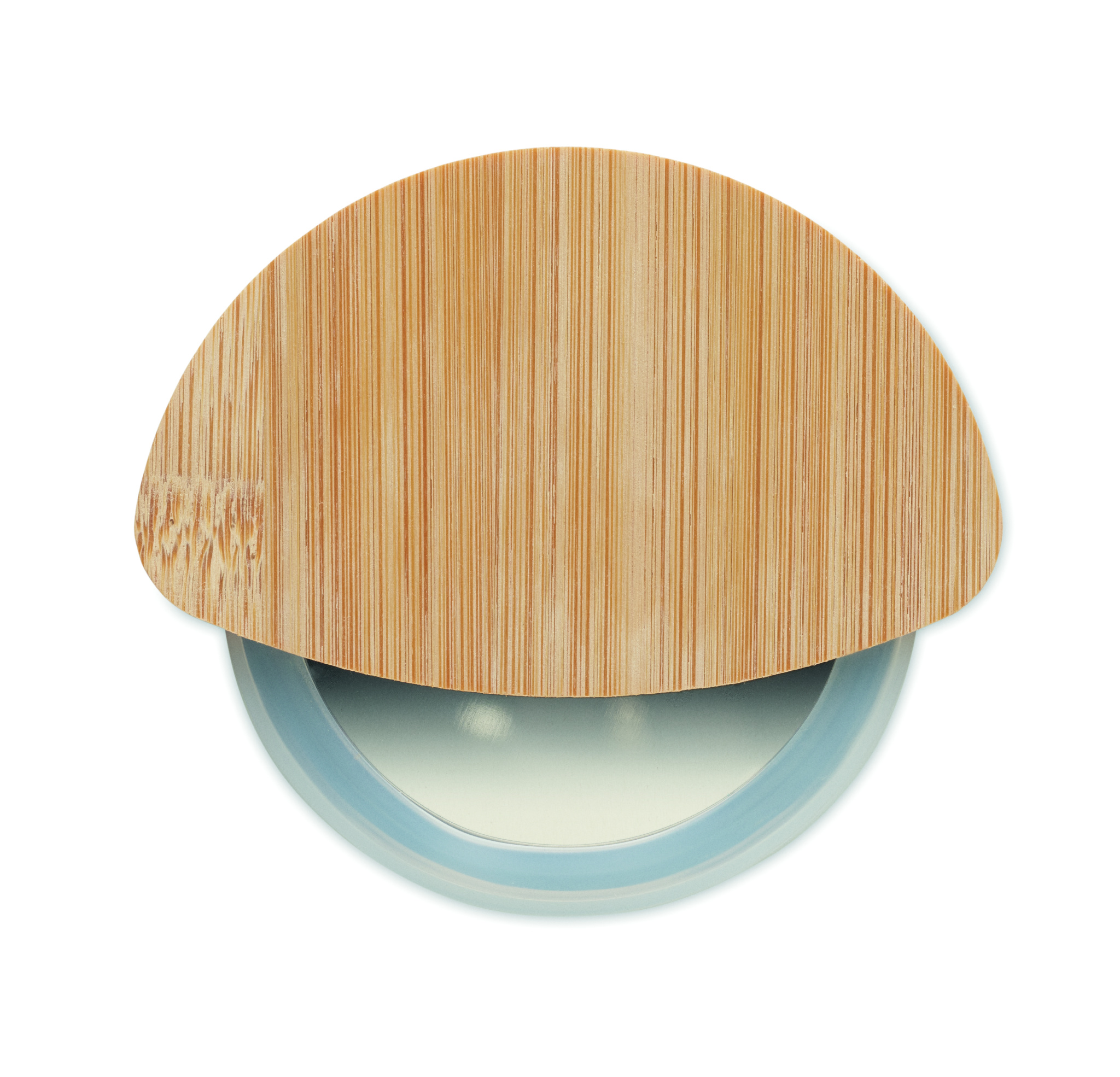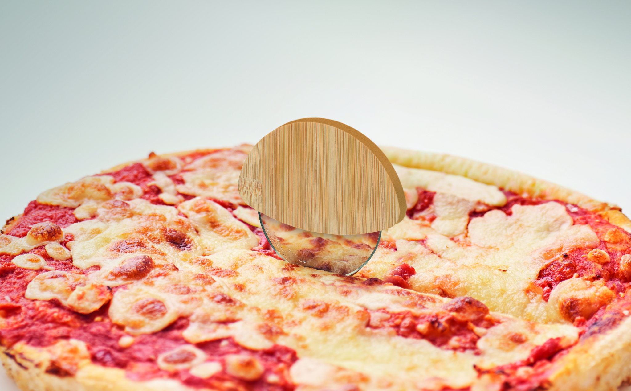 Ümmargune pitsalõikur bambusest käepideme ja roostevabast terasest teraga. Läbipaistva valge silikoonist kaitserõngaga. Mõõdud: 8.5X7.7X1.2 cm