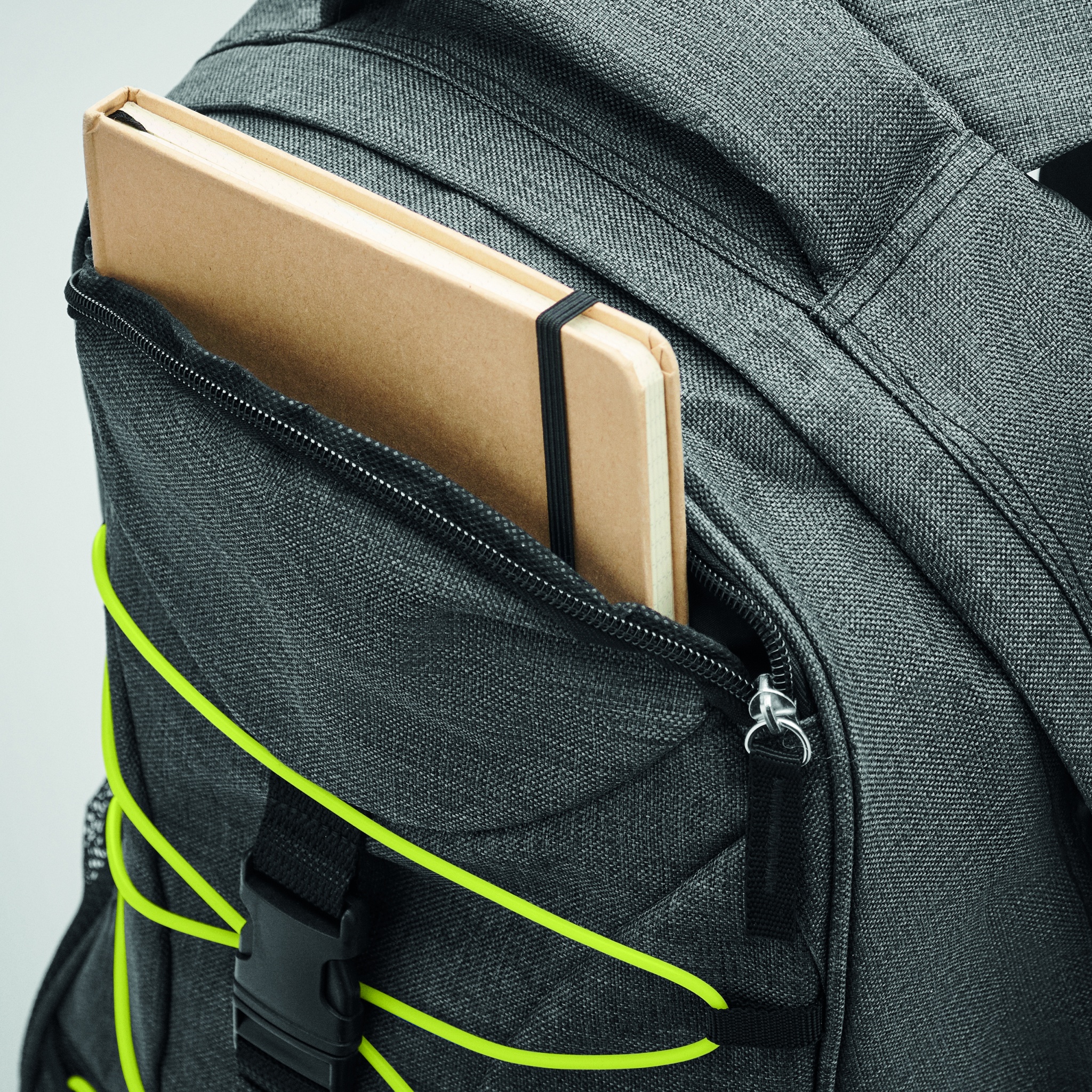 600D 2-toonist polüestrist seljakott, millel on värviline kontrastne pealispind ja helendav esipaneelil olev tumedas nööris. Võrktaskud mõlemal küljel.