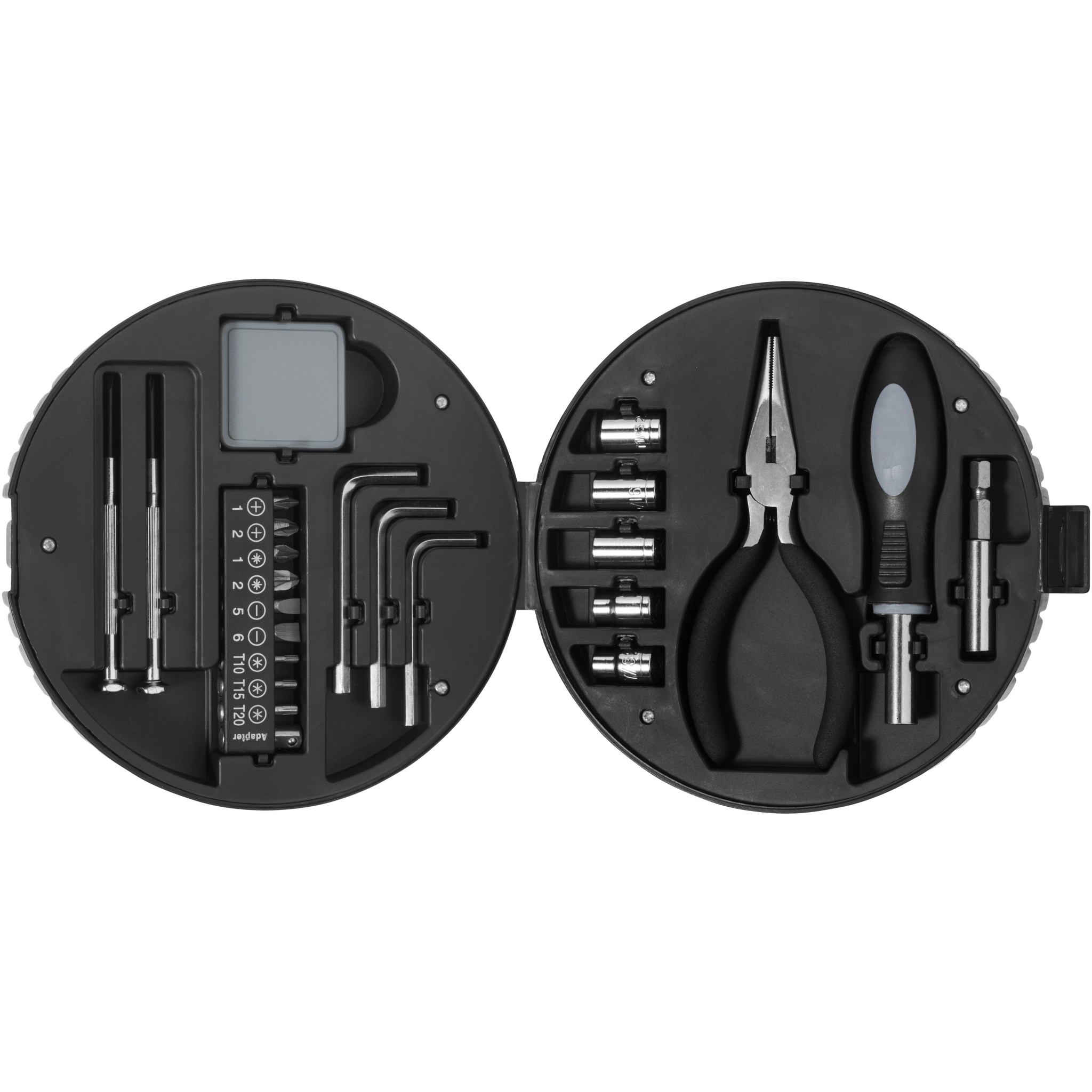 Rage 25-osaline rehvikujuline tööriistakomplekt. 25-osaline tööriistakomplekt sisaldab minimõõturit, ristpeaga kruvikeerajat, lamepeaga kruvikeerajat, 9 otsikut koos adapteriga (4 Phillipsi pead, 2 lamedat pead ja 3 kuuskantpead), 3 kuuskantvõtit, 5 pesa (5-9 mm) ), nõela otsaga tangid, kruvikeeraja käepide ja adapter otsikute jaoks ning mugav ümbris. Pakitud STAC kinkekarpi. Eksklusiivne disain. ABS plastik.