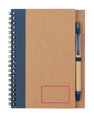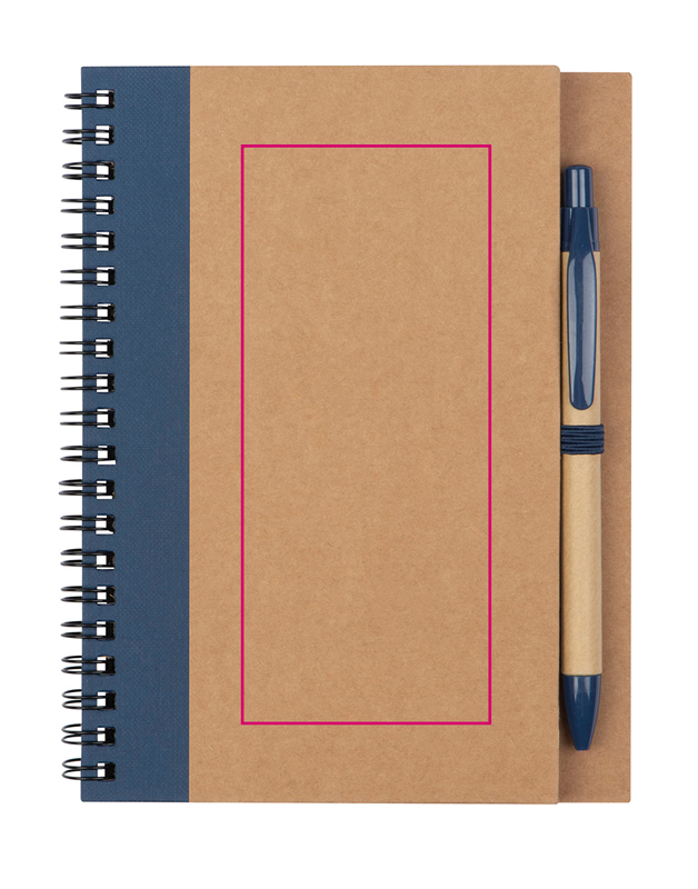 Spiraalköites märkmik 120 taaskasutatud paberist tühja lehega (kaas 250 g/m2, lehed 60 g/m2) ja pliiatsiaas. Kaasas on sobiv taaskasutatud paberist pastapliiats, millel on asendamatu sinise kirjaga täidis ja ABS-plastist aktsent.
