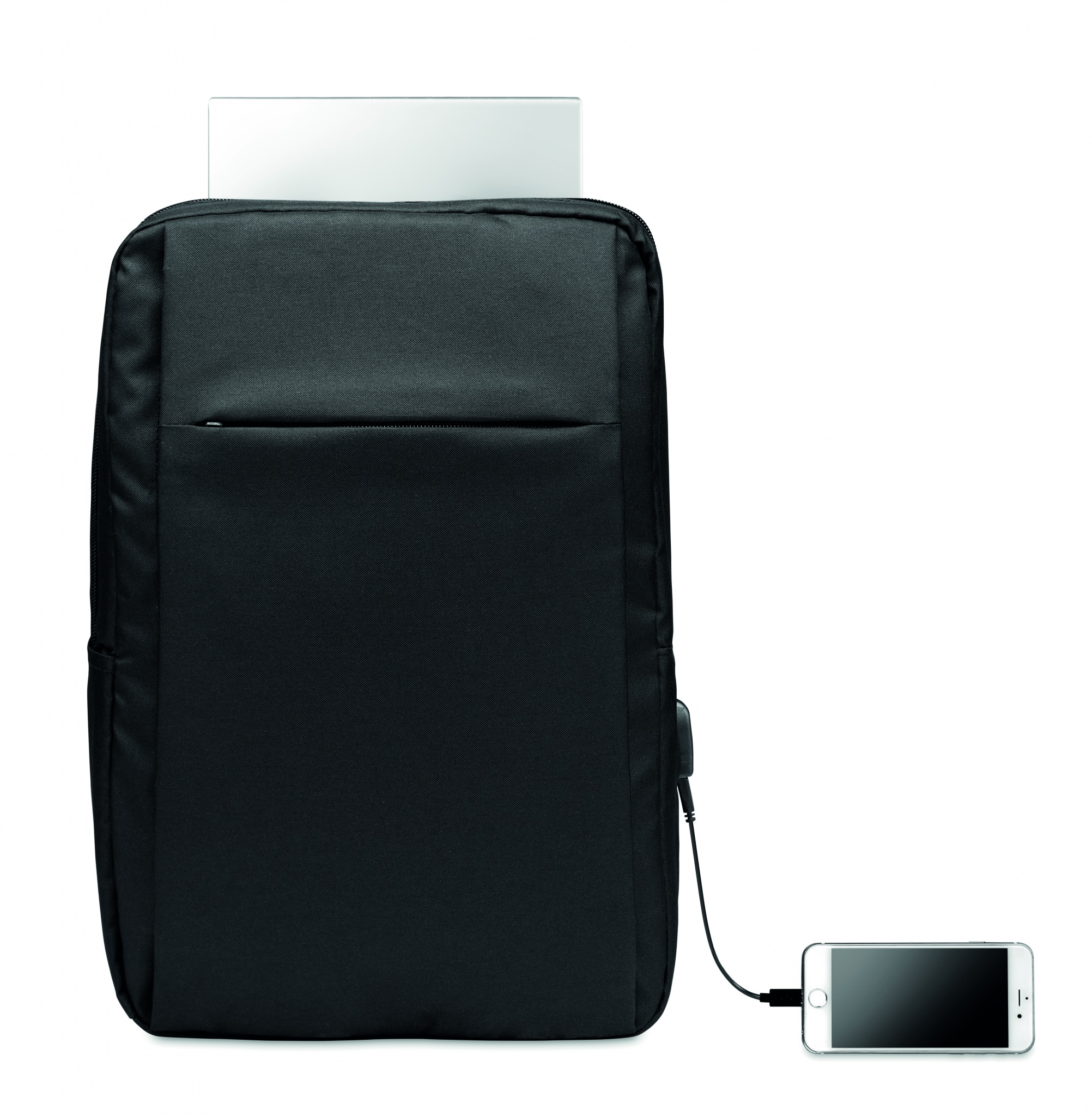 Sülearvuti seljakott 300D RPET polüestrist polsterdatud õlarihmaga, mis sisaldab ühte peamist sisemist sahtlit 16-tollise sülearvuti jaoks ja USB-laadimiskaablit.