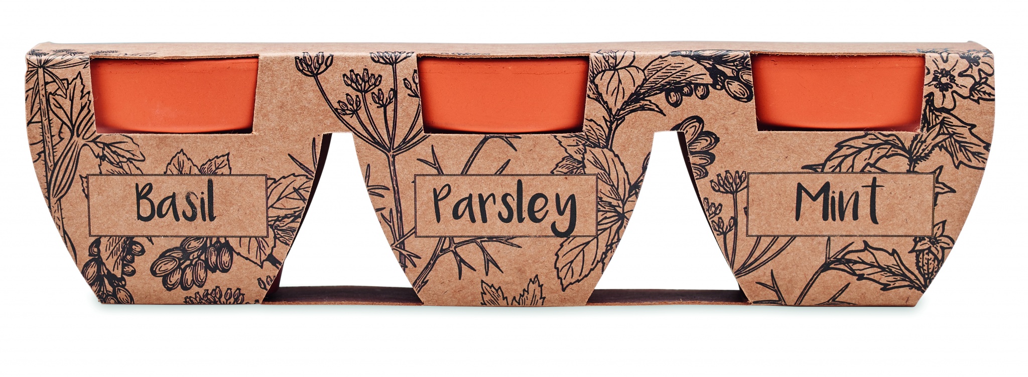 Komplektis 3 savist terrakotapotti, mis sisaldab 3 erinevat 3 erineva ürdi seemet: piparmünt, petersell ja basiilik. Valmistatud EL-is.