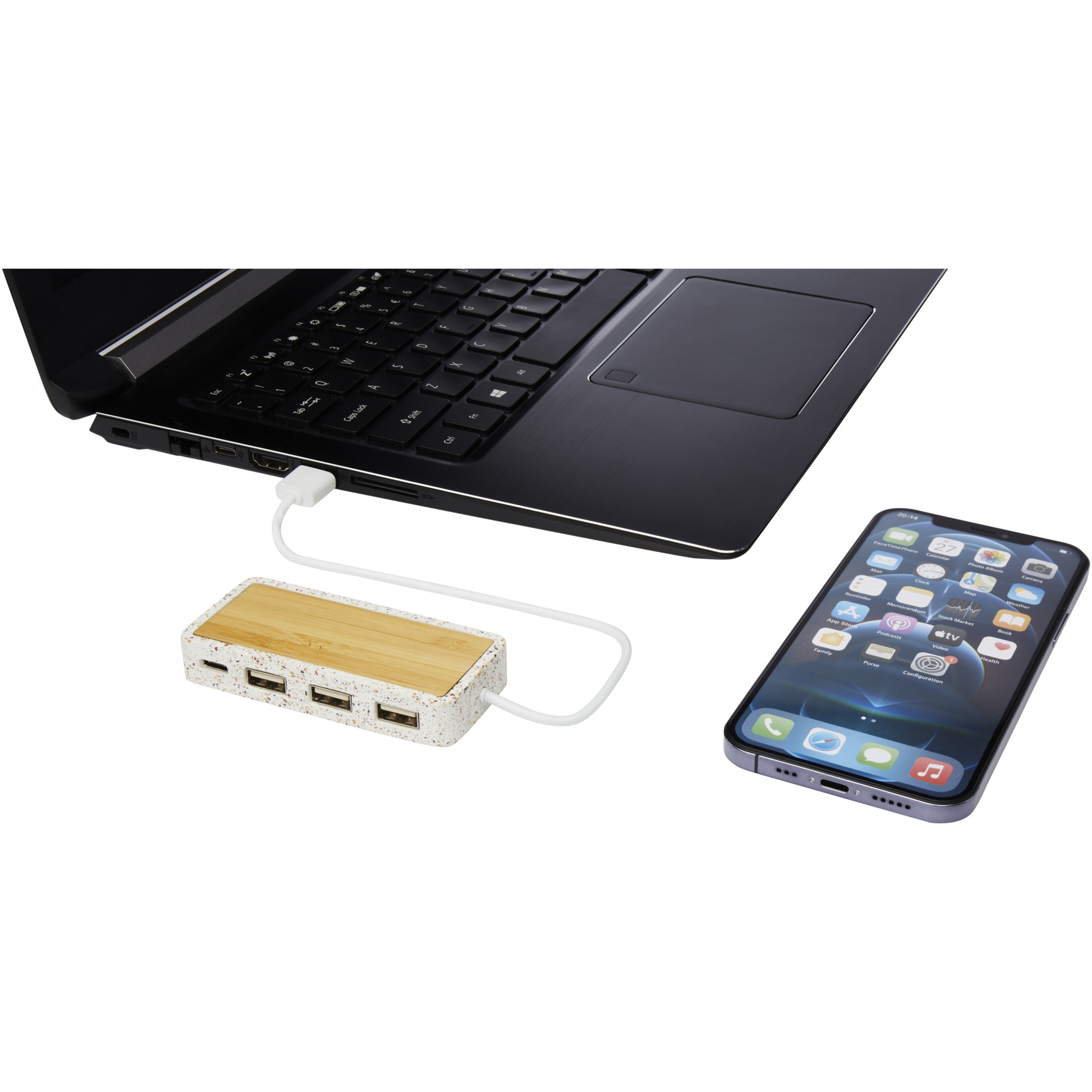 Loodusliku terratso ja bambuse kombinatsioonist valmistatud USB 2.0 jaotur. Sisaldab 1 Type-C ja 3 USB-A väljundit. Tarnitakse kinkekarbis koos kasutusjuhendiga (mõlemad säästvast materjalist).
