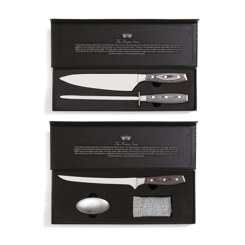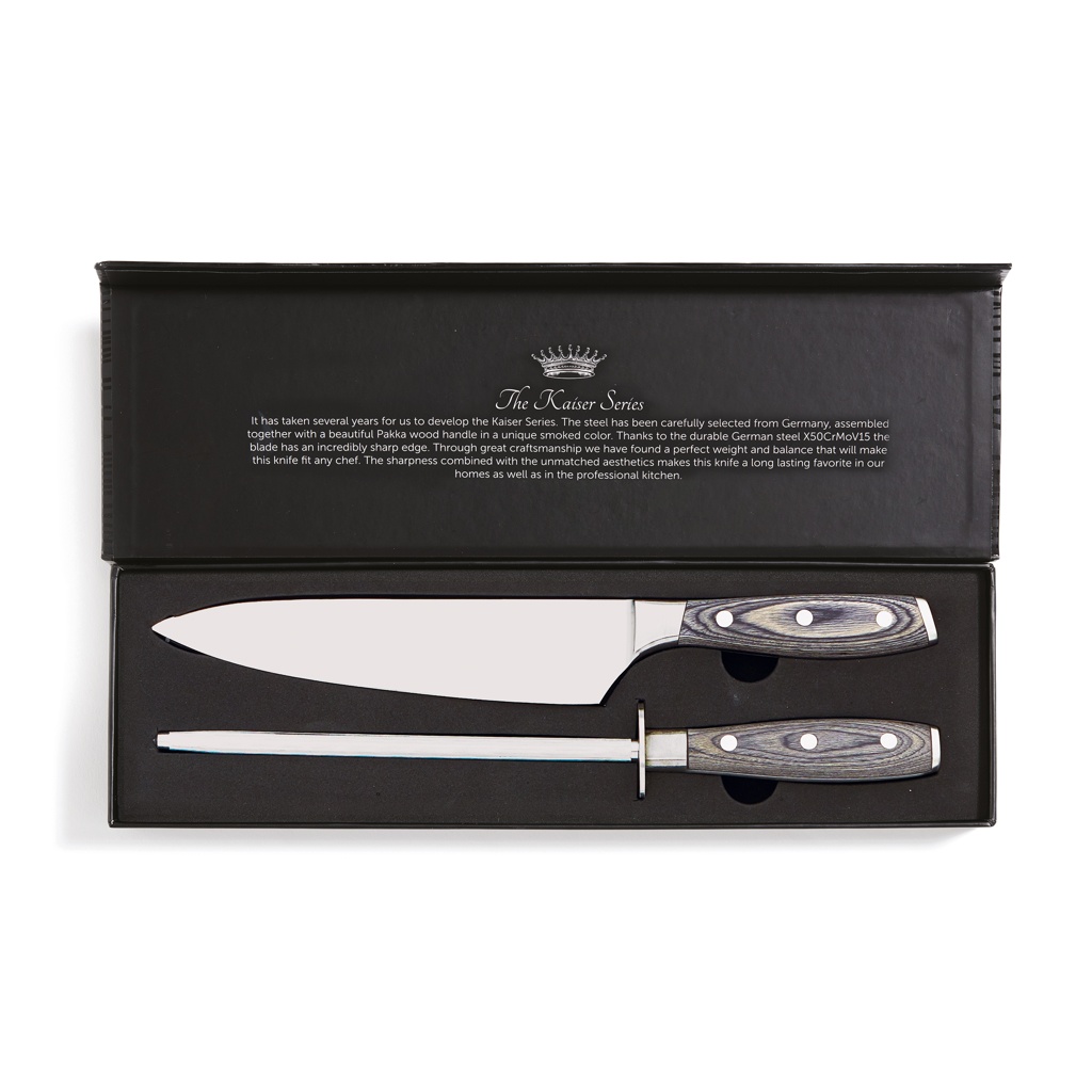 Koka nuga ja lihvimise teras Kaiseri sarjast. Nuga on valmistatud X50CrMoV15 Saksa terasest ja käepide on valmistatud Pakkawoodist. Kergesti haaratav käepide ja tera suurepärane tasakaal muudavad noaga töötamise mugavaks ja lihtsaks. Saksa terasele omased omadused muudavad tera määrdumiskindlaks ja ei vaja rohkem hoolt kui aeg-ajalt teritamine. Koka nuga: 20 cm tera. Teras lihvimine: 33 cm.