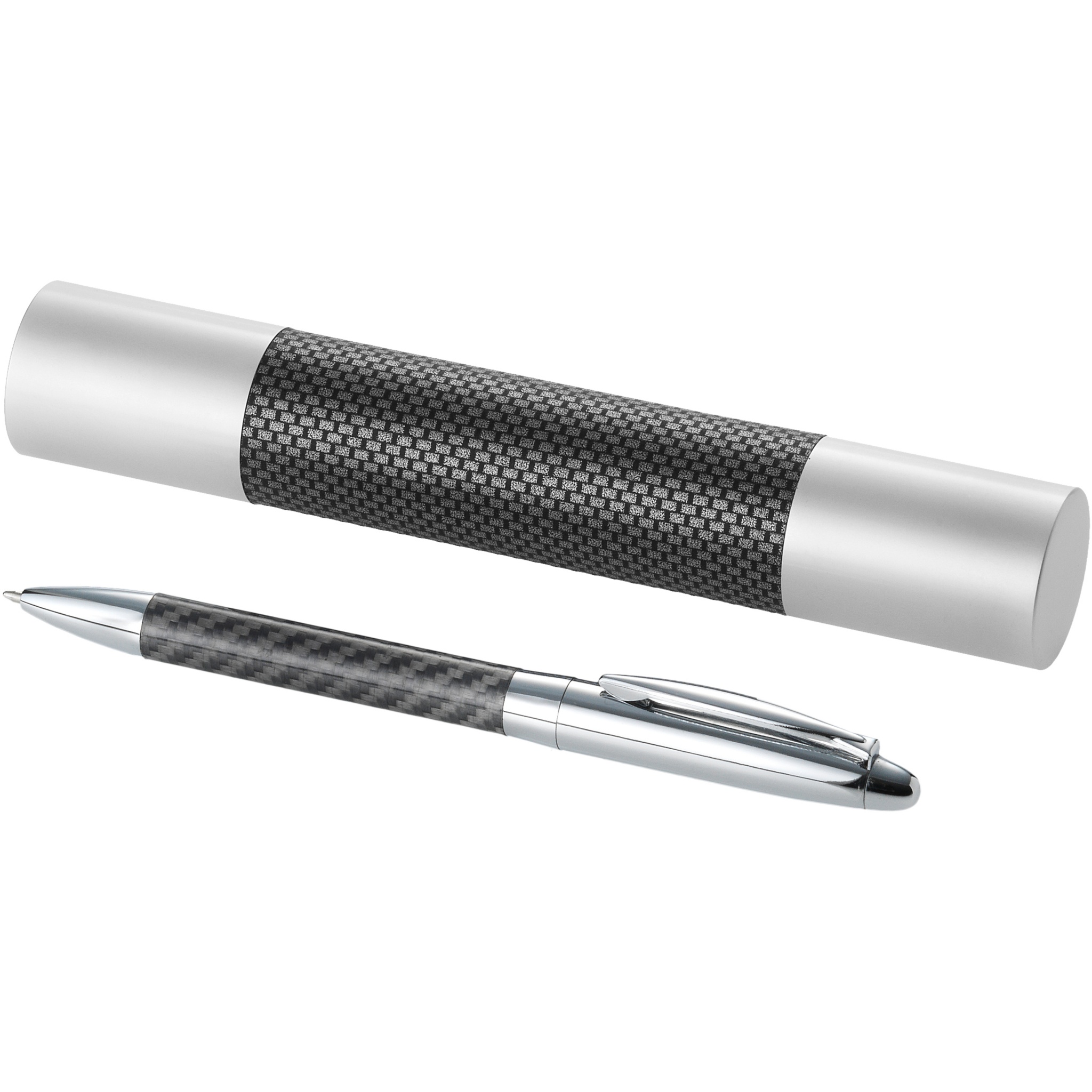 Klassikalise disainiga kuulipunkt läikiva ülemise silindri ja süsinikkiust detailidega alumisel torul. Sealhulgas silindriga kinkekarp.