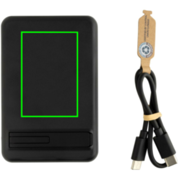 5000 mAh taskusuurune akupank koos 5 W magnetilise juhtmevaba laadijaga, mille korpus on valmistatud RCS-sertifikaadiga taaskasutatud ABS-plastist ja FSC-sertifikaadiga bambusest. RCS (Recycled Claim Standard) on standard, mis kontrollib toote ringlussevõetud sisu kogu tarneahelas. Taaskasutatud kogusisaldus: 22% eseme kogukaalust. Toitepank sisaldab kauakestvat A-klassi 5000 mAh liitiumpolümeerakut. Integreeritud telefonialusega. Toiteindikaatorid näitavad järelejäänud energiataset, nii et teate alati, millal laadida. Type-C sisend 5V/2,4A; Tüüp C väljund: 5V/2A.4A Toode ja tarvikud PVC-vaba. Kaasa arvatud RCS-sertifikaadiga taaskasutatud TPE laadimiskaabel. Pakitud FSC® segupakendisse.