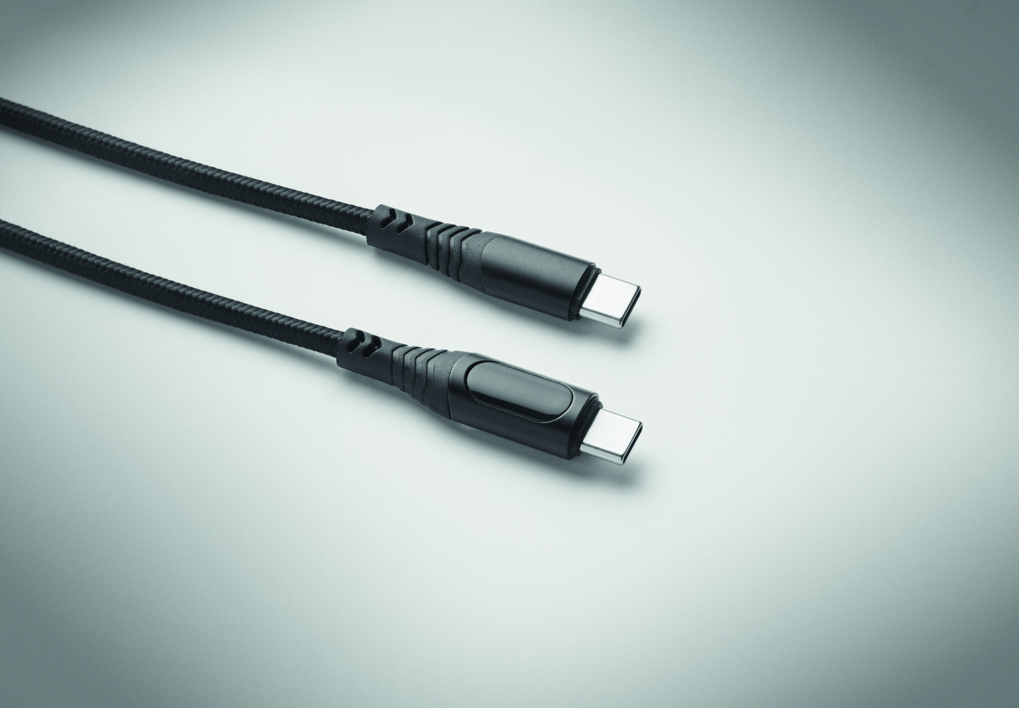 Jopa 100 W:n lataus- ja datakaapeli C-C-liittimestä LED-näyttöön, jossa lataustehon näyttö. Pituus 1 m.