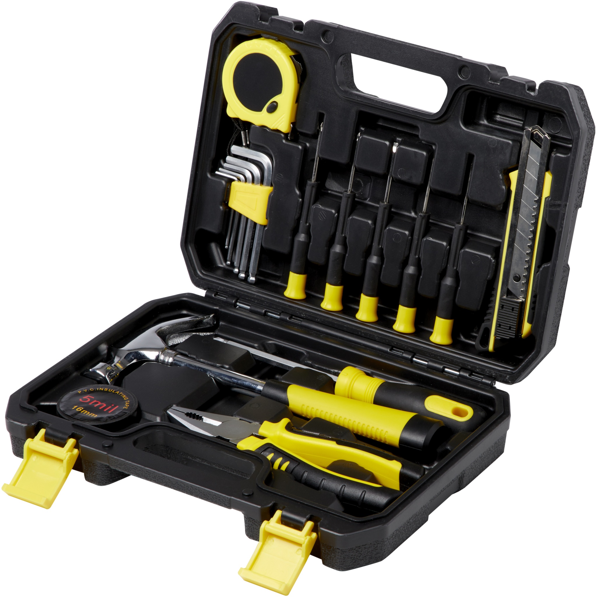 Työkalulaatikko liukumekanismi-lukitusjärjestelmällä sisältää puusepän vasaran, 3,5m mittanauhan lukitusominaisuudella, jakoavaimen, leikkurin lukitusominaisuudella, kolmesuuntaisen tasoittimen, 8 kuusikulma-avainta (1,5-6mm) telineessä, pitkävartiset pihdit, johtoleikkurin, jännitteen testaavan ruuvimeisselin, 4 tarkkuusruuvimeisseliä (litteä ja Philips)ja ruuvimeisselin kahvan 10 osalla (PH, PZ, taulu, hex ja sovitin) telineessä.
