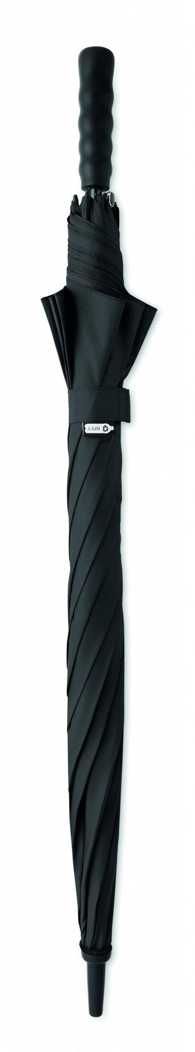 27 tuuman automaattisti avattava tuulenpitävä sateenvarjo 190T RPET pongeesta. Lasikuituinen varsi ja ruoteet. Vehmänolki-ABS Kierrätetty- kahva. Muoviset kärjet ja yläosa.