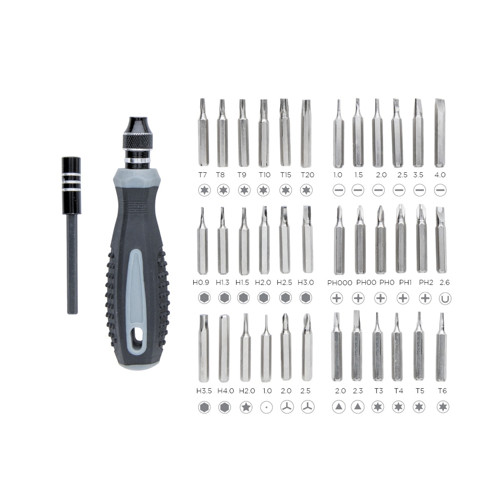38-osainen työkalusetti kärkipitimellä. Pitimet valmistettu hiiliteräksestä. ABS kotelo läpinäkyvällä yläosalla.