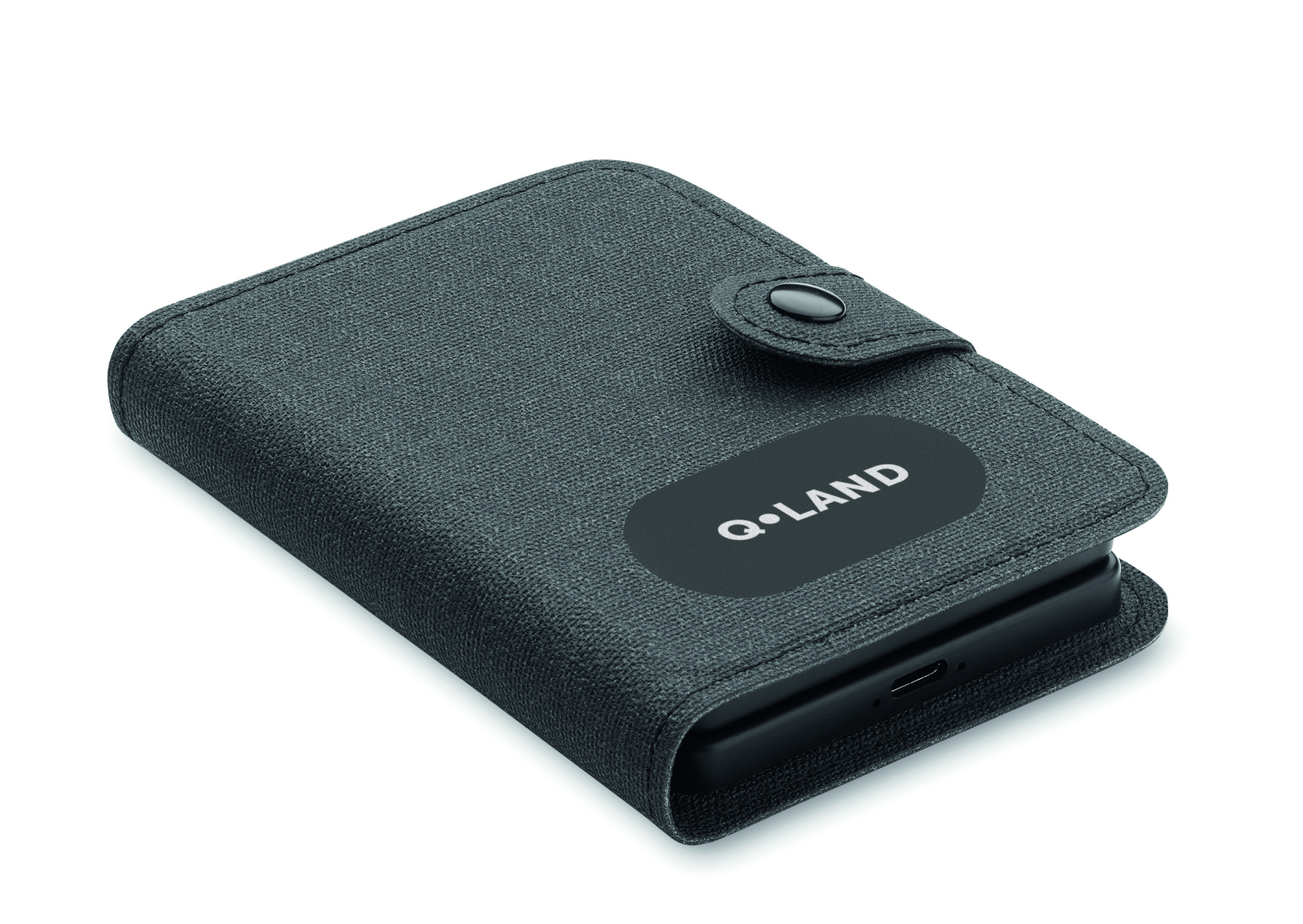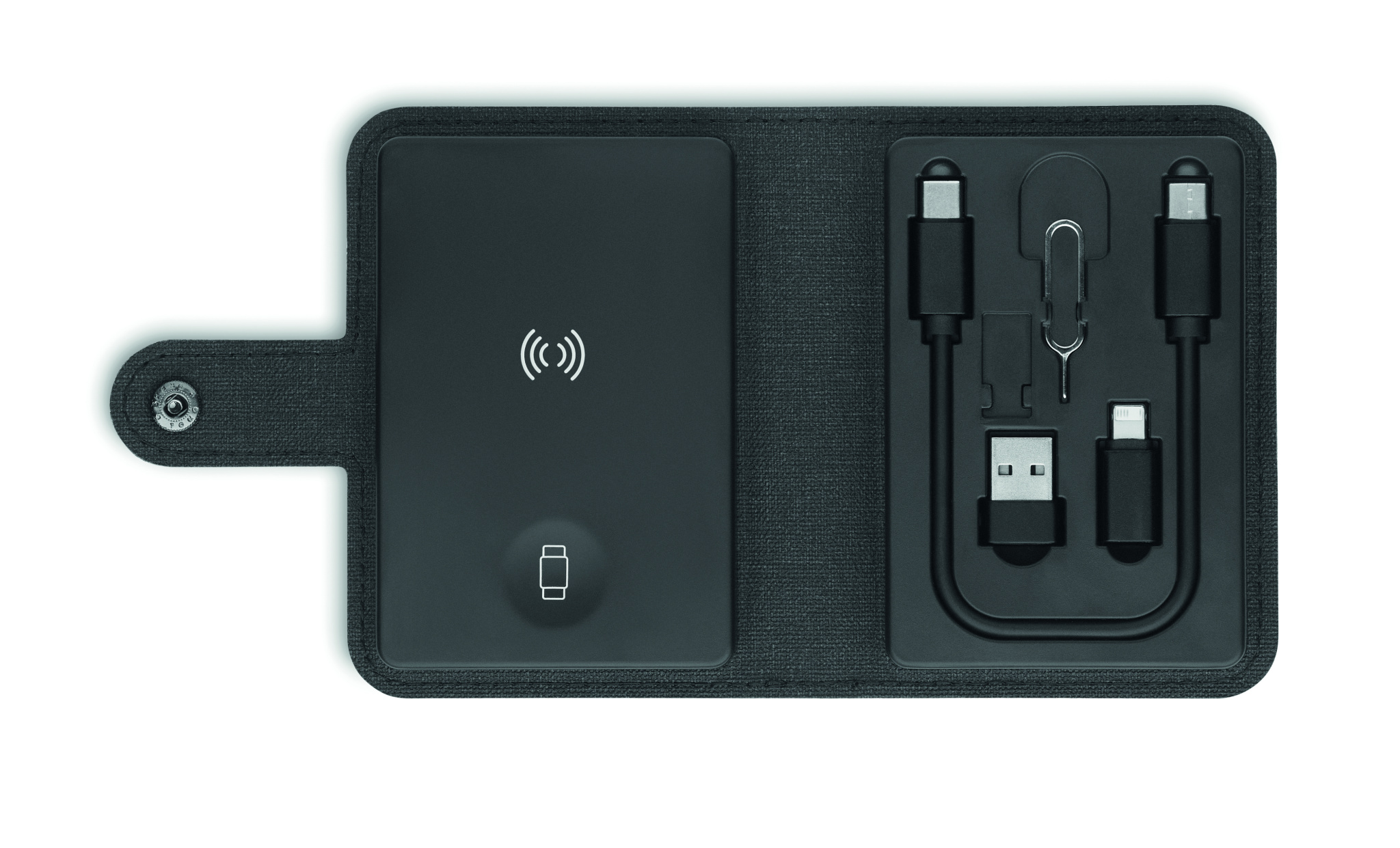 Kaapeliliitinsarja, jossa on langaton 15 W laturi ja kellolaturi (vain Apple®). 4 in 1 -latauskaapeli ejektorin tappityökalulla. Kierrätetty PU-kansi, muovit kierrätetystä ABS:stä ja kierrätetty alumiinilevy.