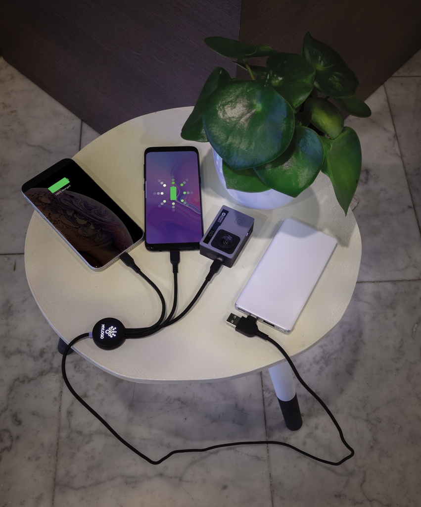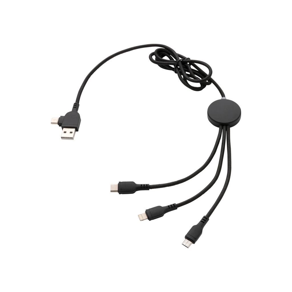 Pudottu nylonkaapeli viidellä eri liitännällä: USB-C ja USB-A sisääntulot, tyyppi C, iOS ja micro USB ulostulot. Tämän ansiosta voit käyttää kaapelia myös laitteilla, jotka hyödyntävät tyypin C -liitäntää. Kaapelissa on myös USB-A sisään- ja ulostulovaihtoehto, joten sillä voi ladata melkeinpä mitä tahansa laitetta mistä tahansa virtalähteestä. ABS kotelo laserkaiverrusmahdollisuudella, jolla saadaan tuotteeseen logo, jossa syttyy valo, kun kaapeli on käytössä. PVC vapaa. Pituus 120 cm.
