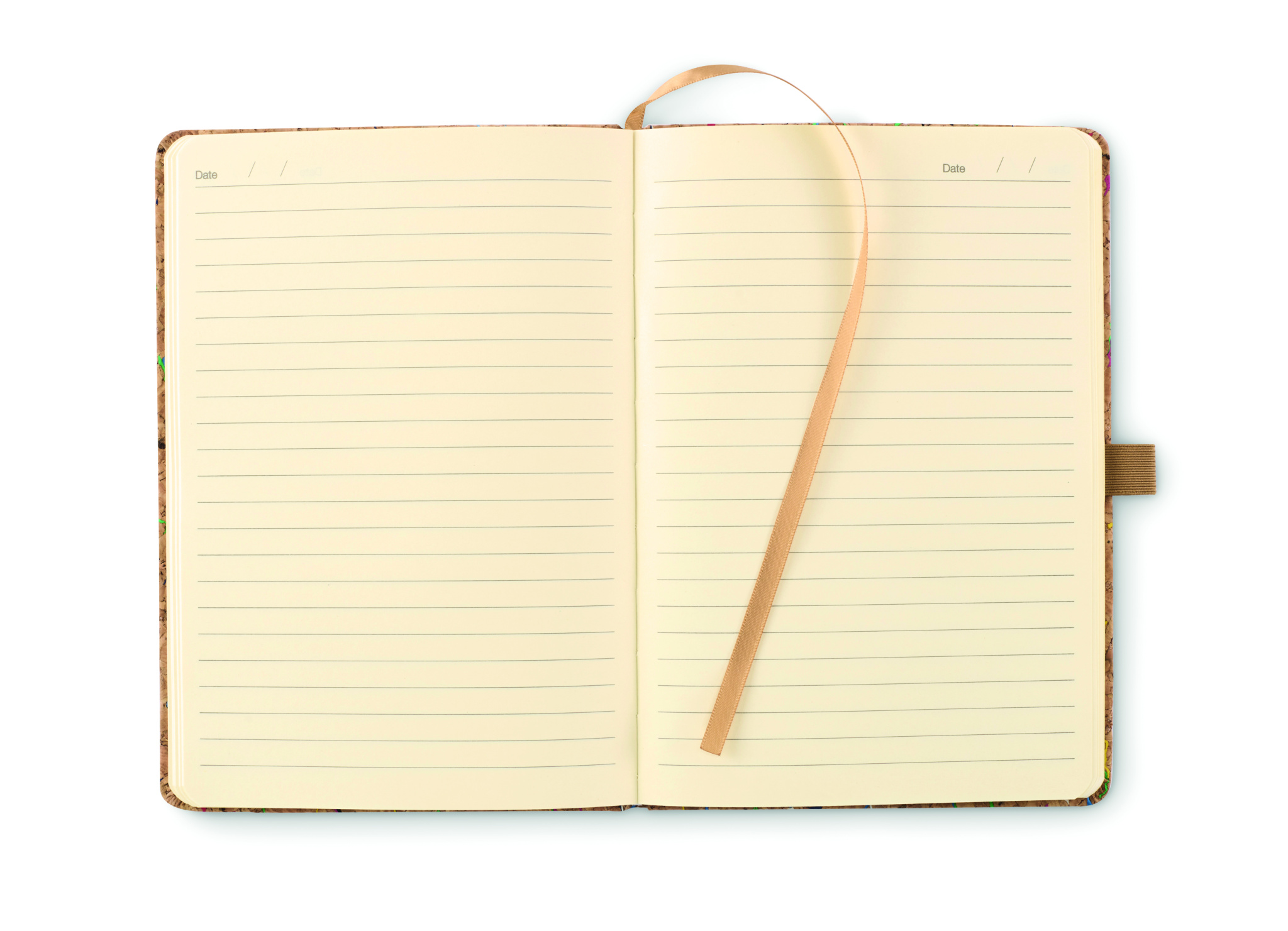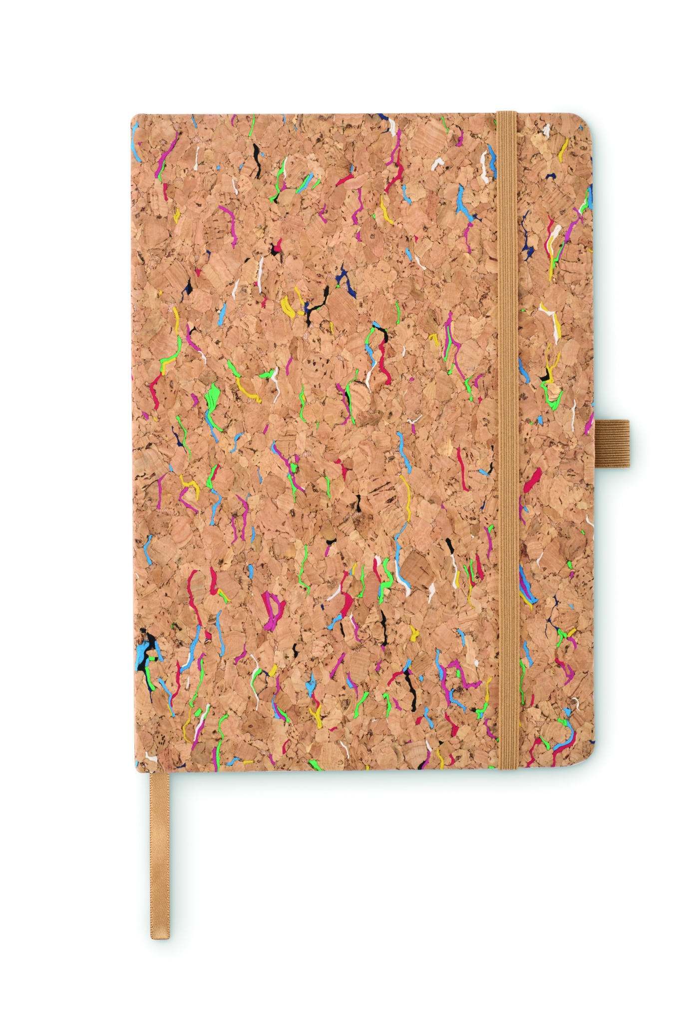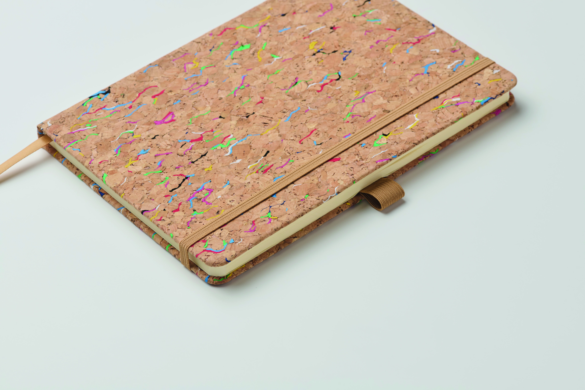 A5-kokoinen muistikirja kovavärisellä korkkikansi. Asia sidottu. 192 rivillinen paperi (96 arkkia). Joustava sulkuhihna, kirjanmerkkinauha ja joustava kynäpidike.