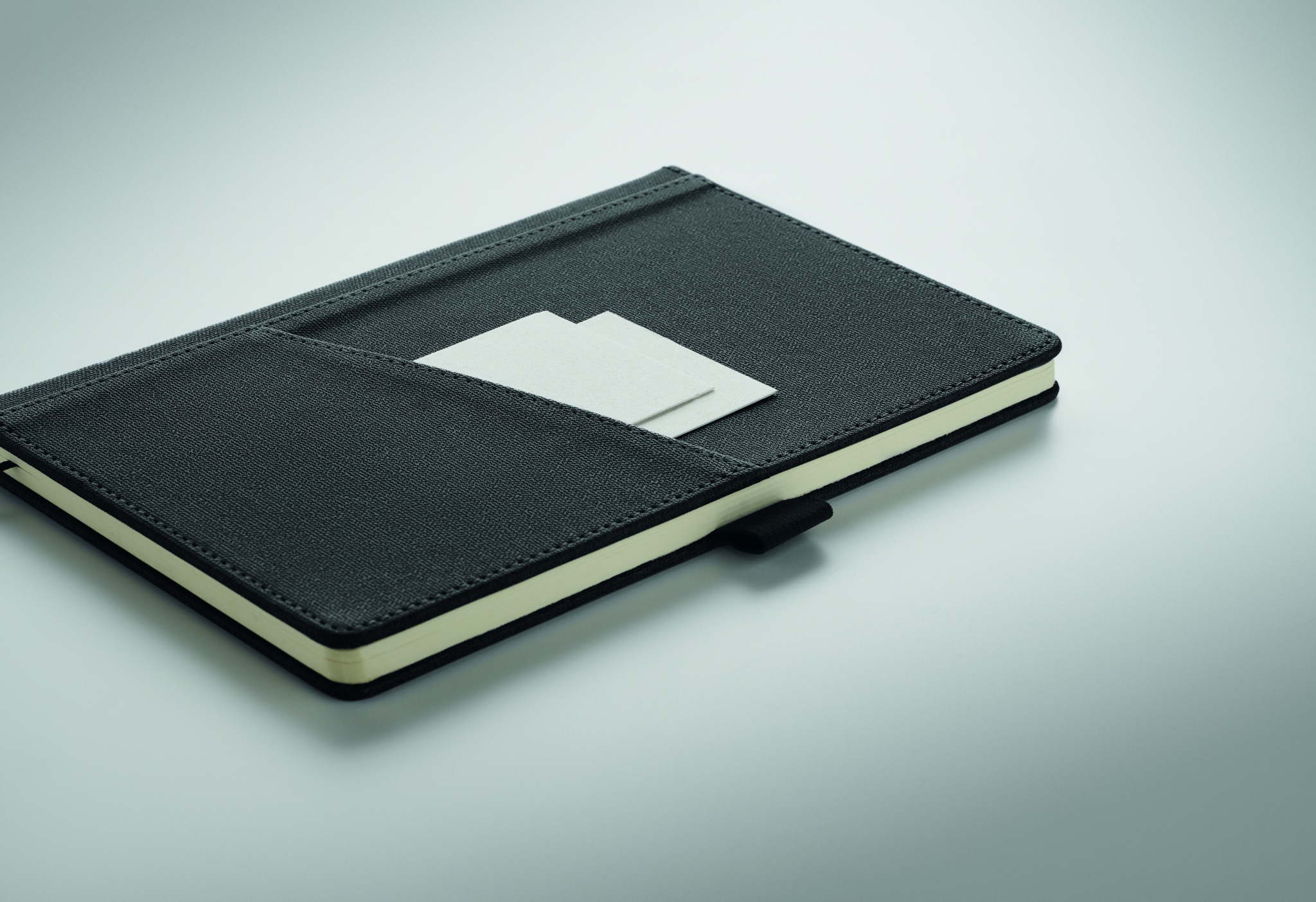 A5-muistikirja, jossa on PU-kova kansi ja puhelintasku edessä. Koteloitu. 160 viivoitettua sivua kierrätyspaperista (80 arkkia). Yhteensopiva kirjanmerkkinauha.