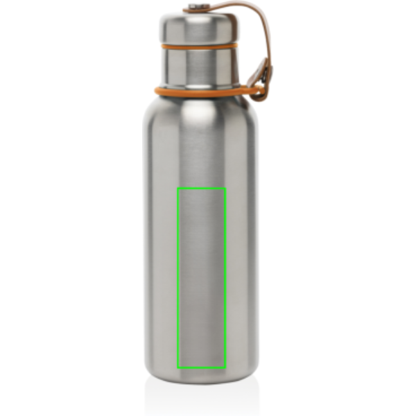 Ruostumattomasta teräksestä valmistettu vesipullo on tyylikäs tyhjiösuljettu pullo, joka pitää juomat kylmänä 24 tuntia tai kuumana 12 tuntia. Korkki on myös täysin ruostumatonta terästä, joten vesi ei pääse kosketuksiin muovin kanssa. Keinonahkainen kantolenkki toimii viehättävänä yksityiskohtana. Vain käsinpesu