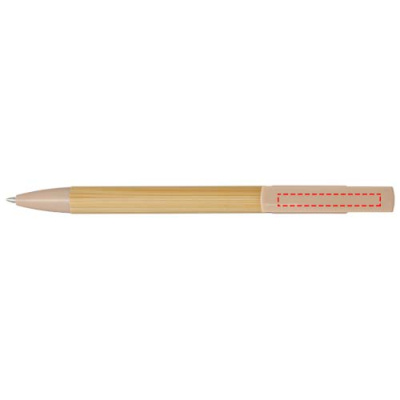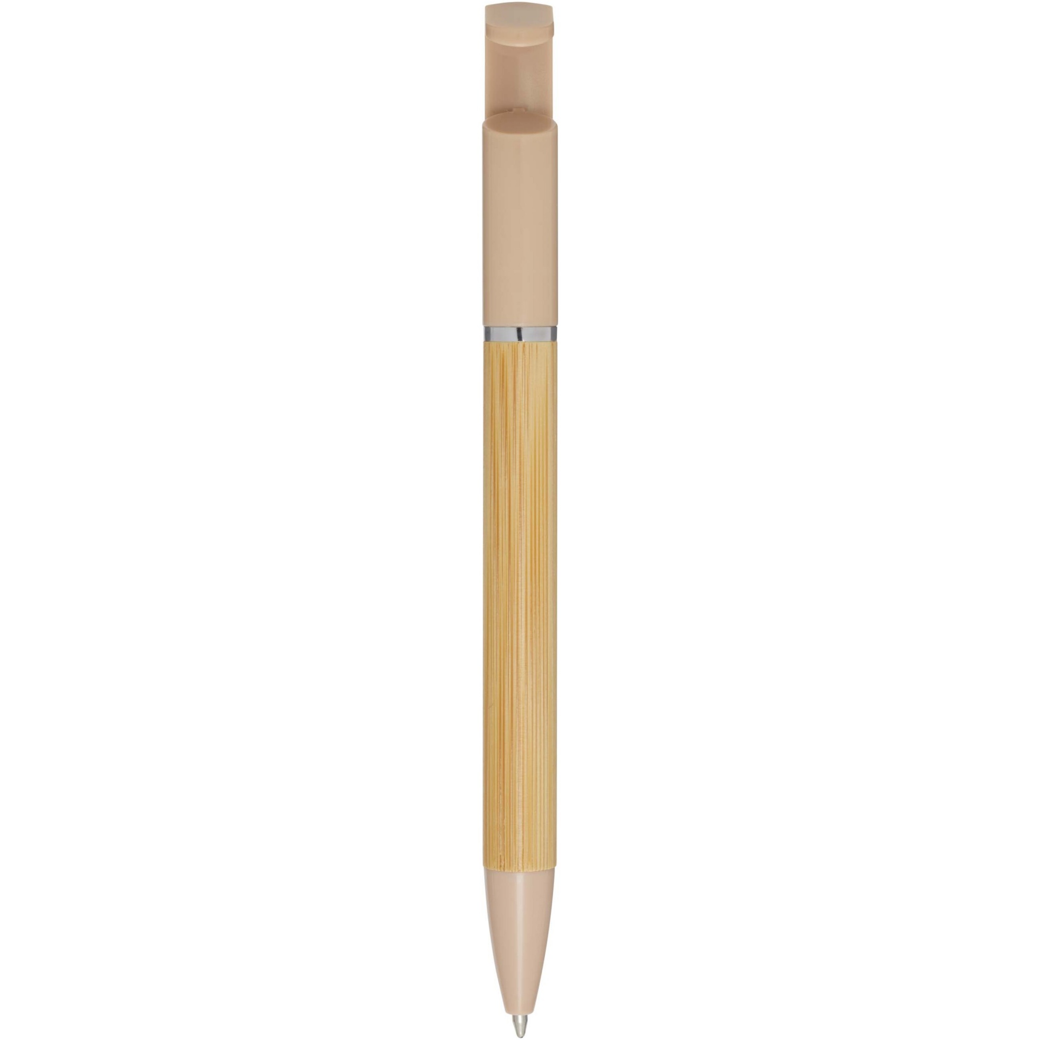Bambukuulakärkikynä, jota voi käyttää myös puhelimen pidikkeenä. Painike ja keskiosan rengas on valmistettu kierrätetystä muovista, kärki messingistä ja runko vastuullisesti tuotetusta bambusta. Musteen väri: Musta. Kirjoituspituus: 1000 metriä. Lyijyn paksuus: 1,0 mm.
